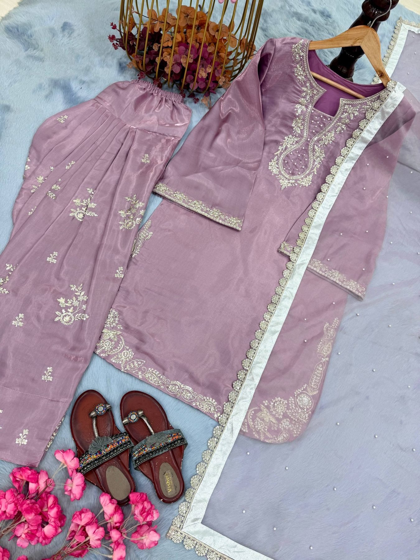 Elegant Roman glass silk suit set featuring heavy sequins and rivet moti work with stylish bell sleeves. Paired with farshi plazzo and organza dupatta, perfect for festive and wedding occasions.