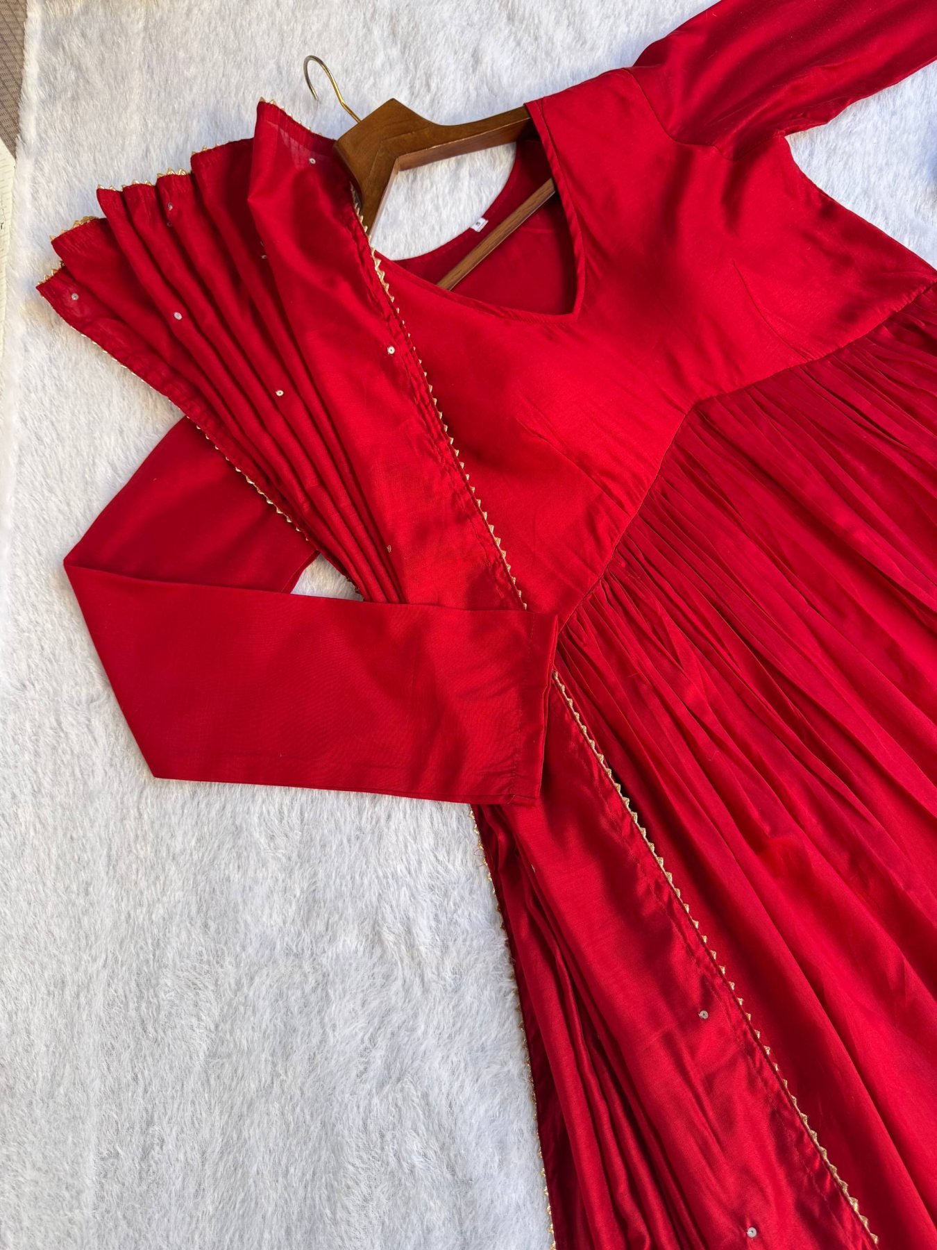 Exceptional Red Chanderi Cotton fully stiched flared gown with Dupatta and Pant