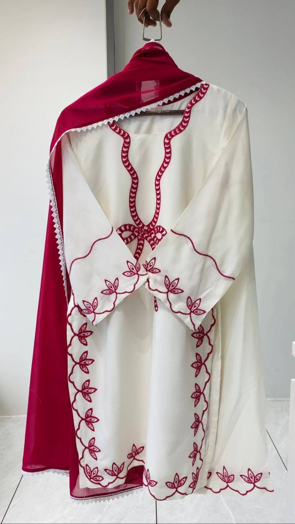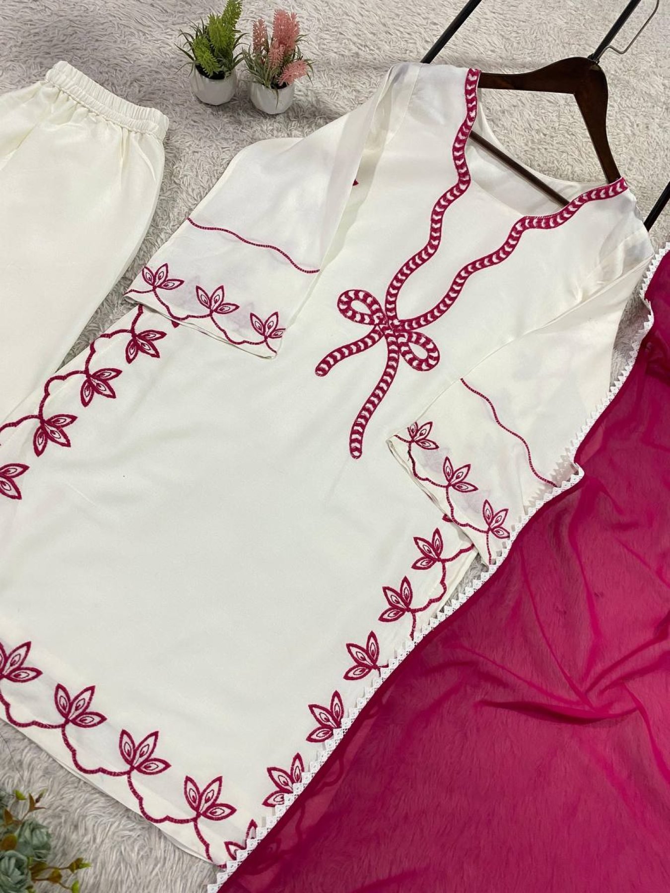 Exceptional White Pakistani-Style Suit Embroidered Work And Matching Magenta Dupatta