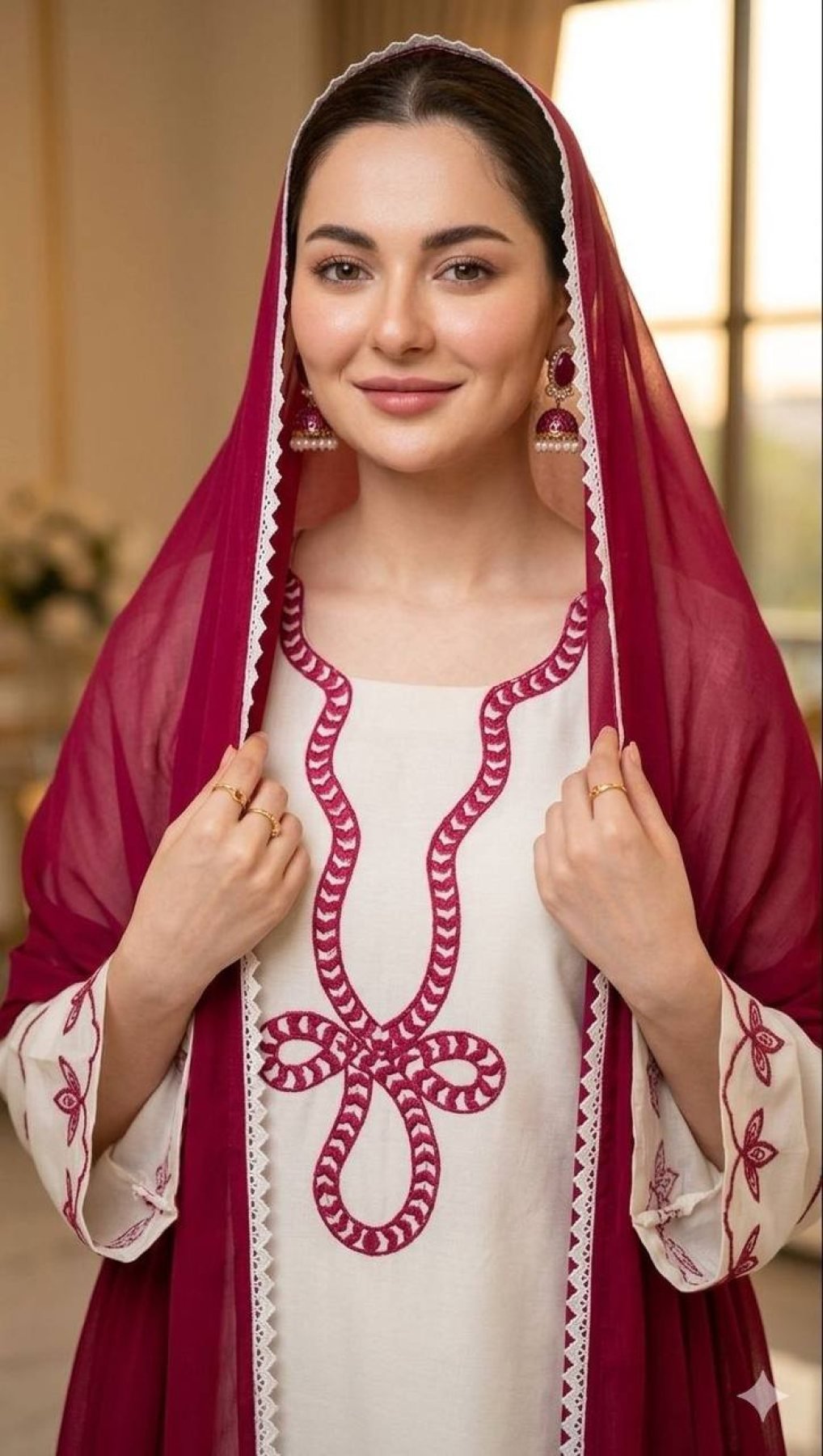 Hania Aamir inspired Pakistani suit set crafted in soft rayon fabric with elegant embroidery work, paired with matching plazzo and lightweight georgette dupatta. Perfect for summer wear, casual outings, and festive styling.