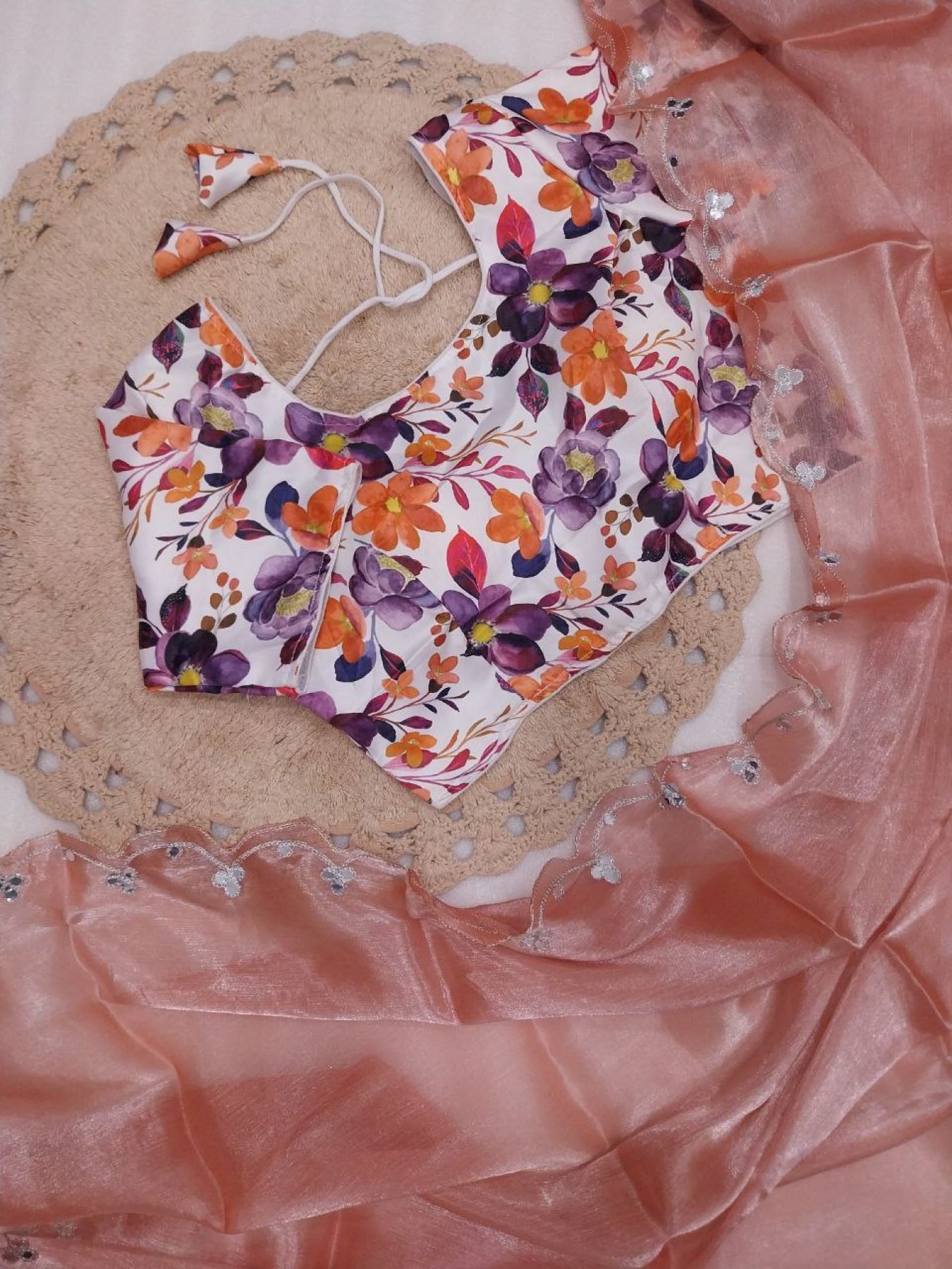 Elevate your festive wardrobe with our exclusive elegant launch – RO783, featuring a beautifully soft premium Jimmy Choo saree. This graceful drape comes adorned with intricate foil mirror aarco embroidery work across the border, making it perfect for festive occasions, weddings, or evening celebrations. It is paired with a stylish floral satin blouse in a contrasting tone to complete the look.