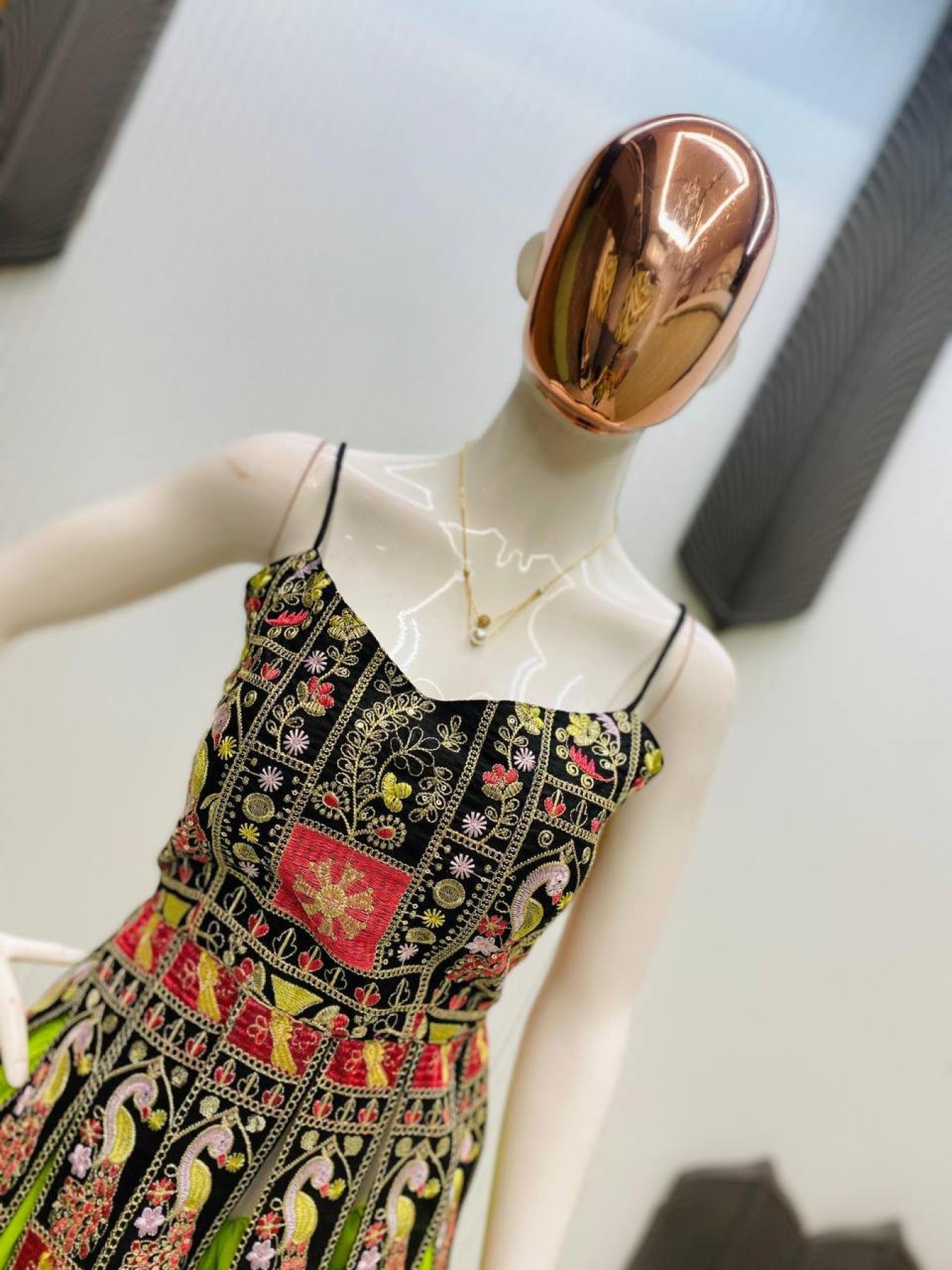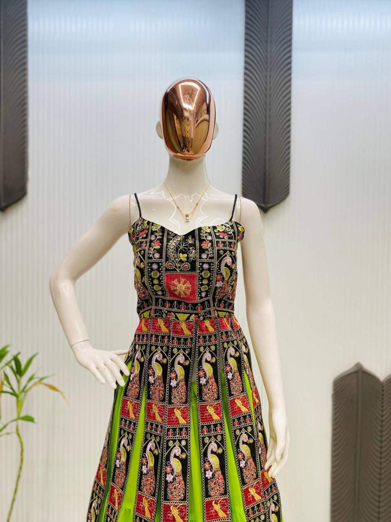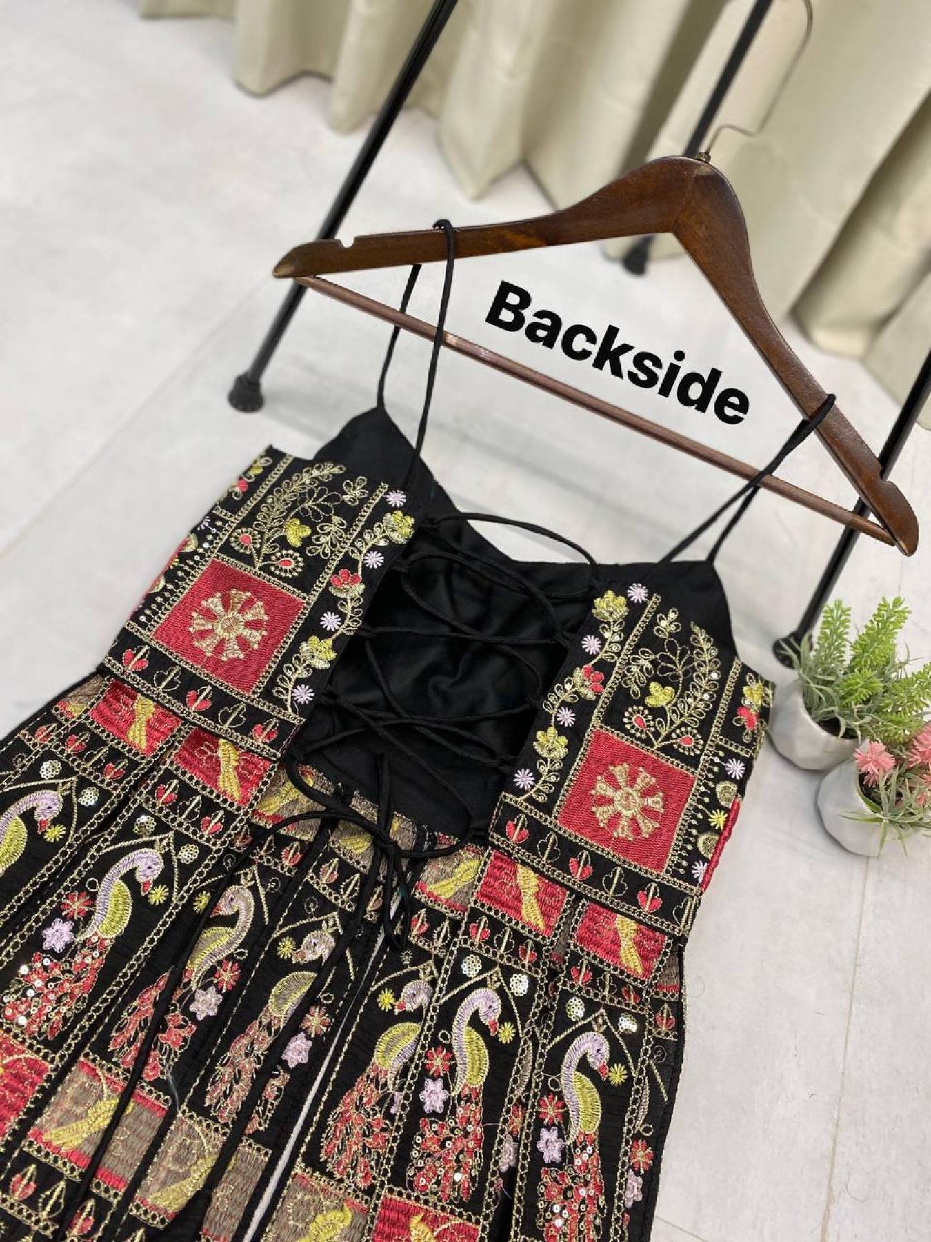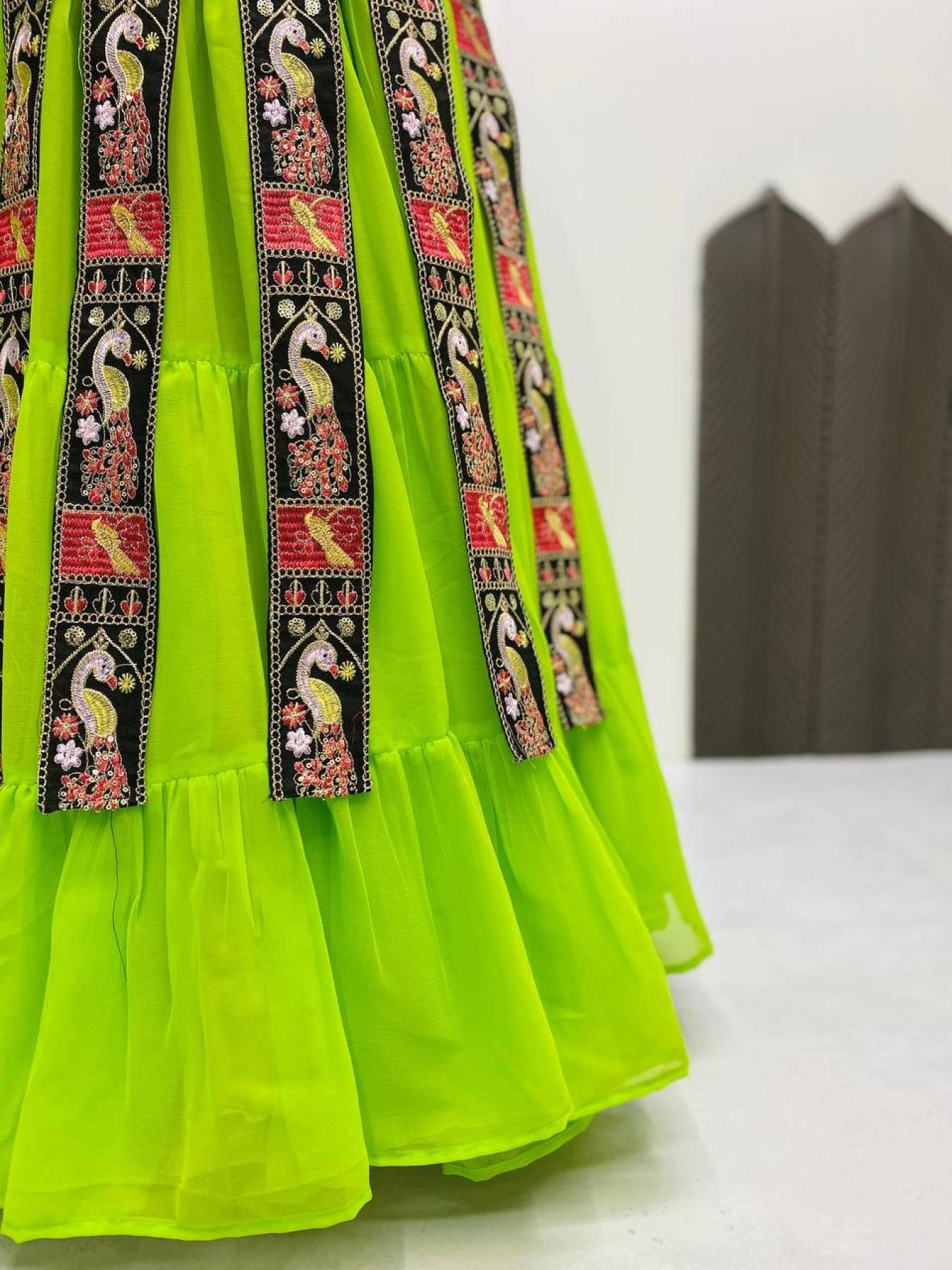 Step into this festive season with our exclusive & trending designer Lehenga Choli, crafted to perfection for Navratri and Garba nights. Designed with premium Bangalorey fabric blouse featuring sequence embroidery, paired with a 4-layered ruffle georgette lehenga, this set ensures a stylish, modern yet traditional look.
