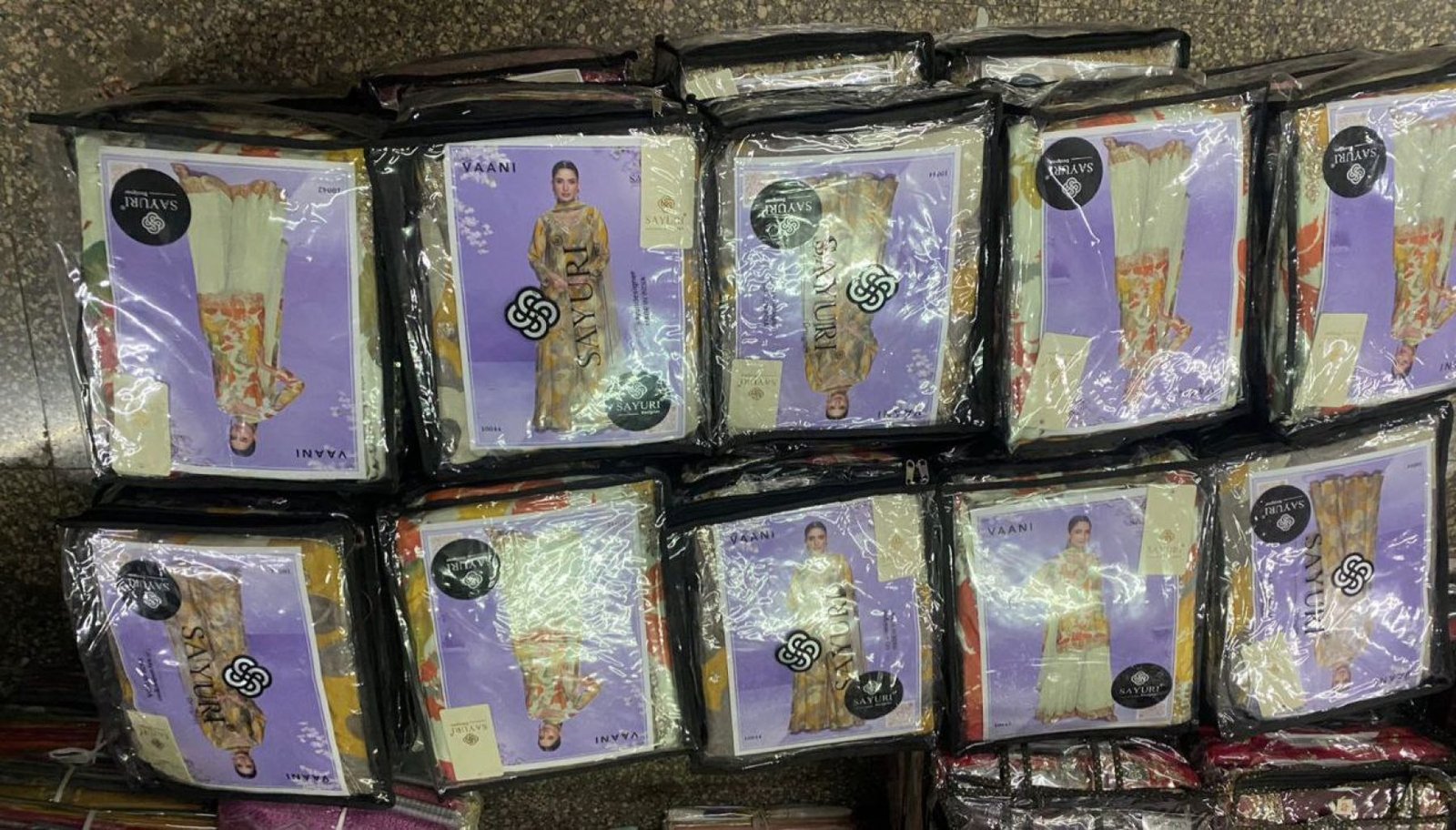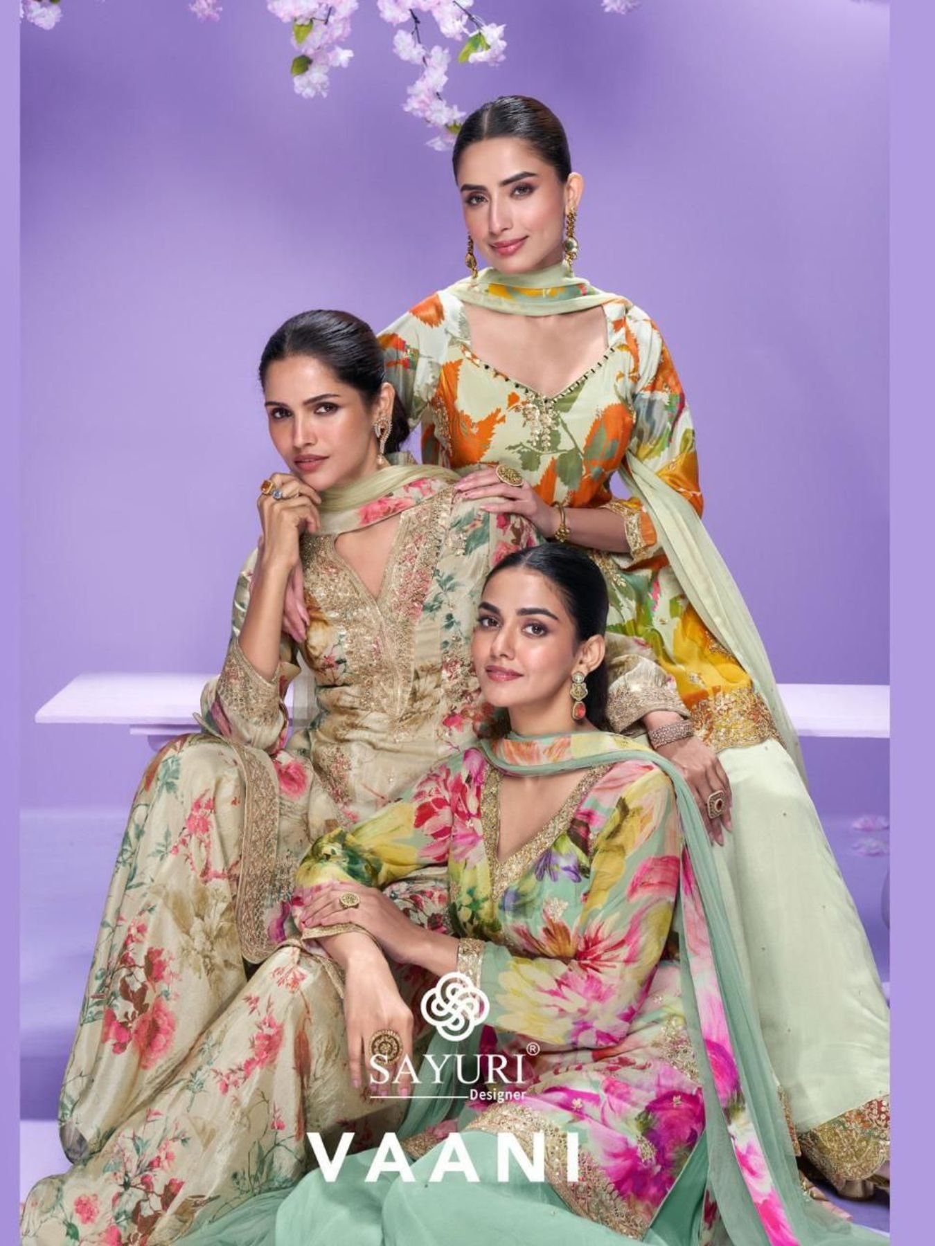 Sayuri presents the new Vaani Catalog (10041 Series) – a designer collection crafted in real premium chinon silk. Each set comes with a heavily embroidered top embellished with hand mirror work, paired with a matching palazzo and soft net dupatta. Available in XL size, this catalog features 4 exclusive pieces, and all designs are available for single purchase.