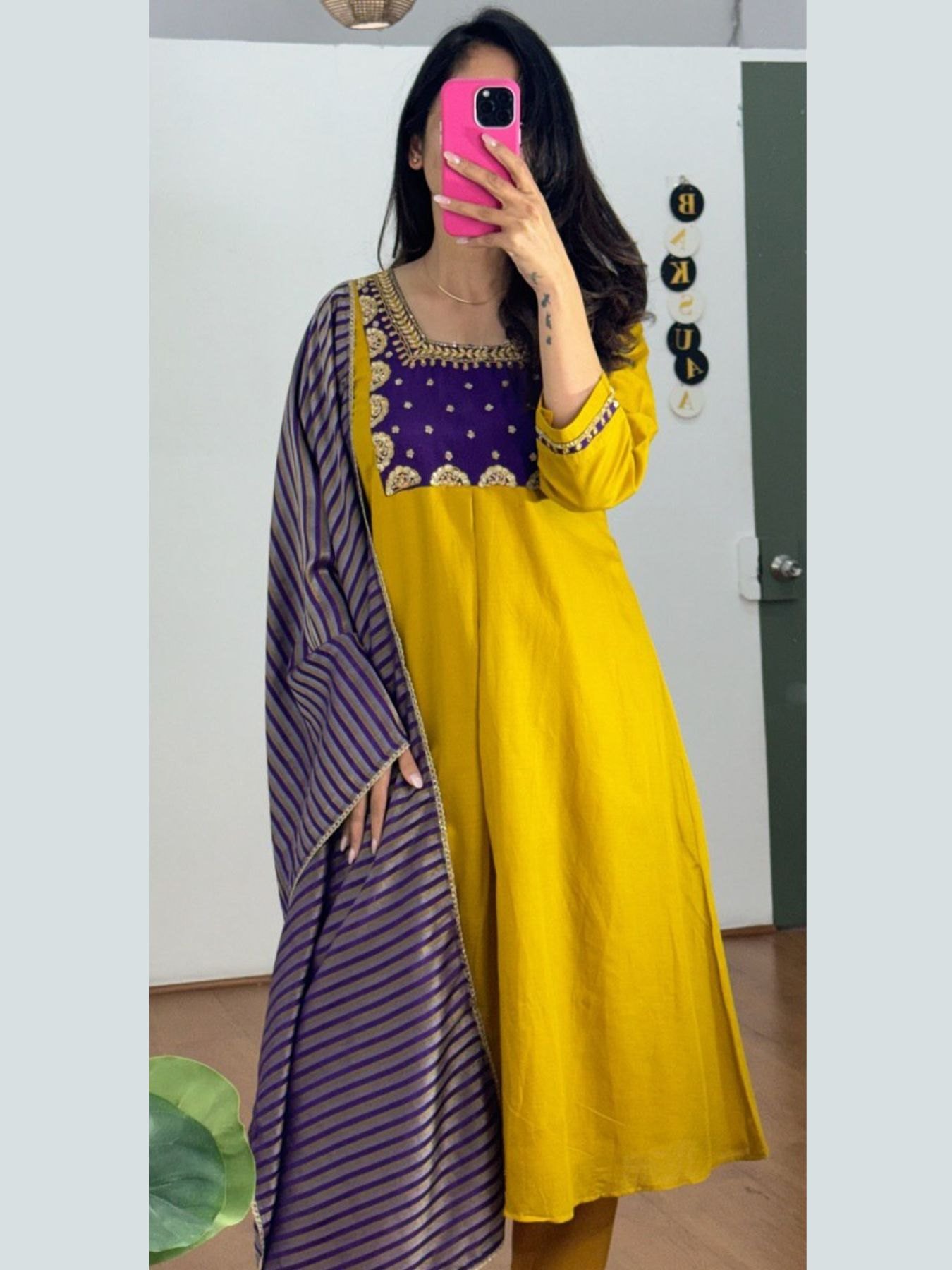 Exclusive Yellow PV Chanderi Kurti Pant Dupatta Set with Embroidery Work