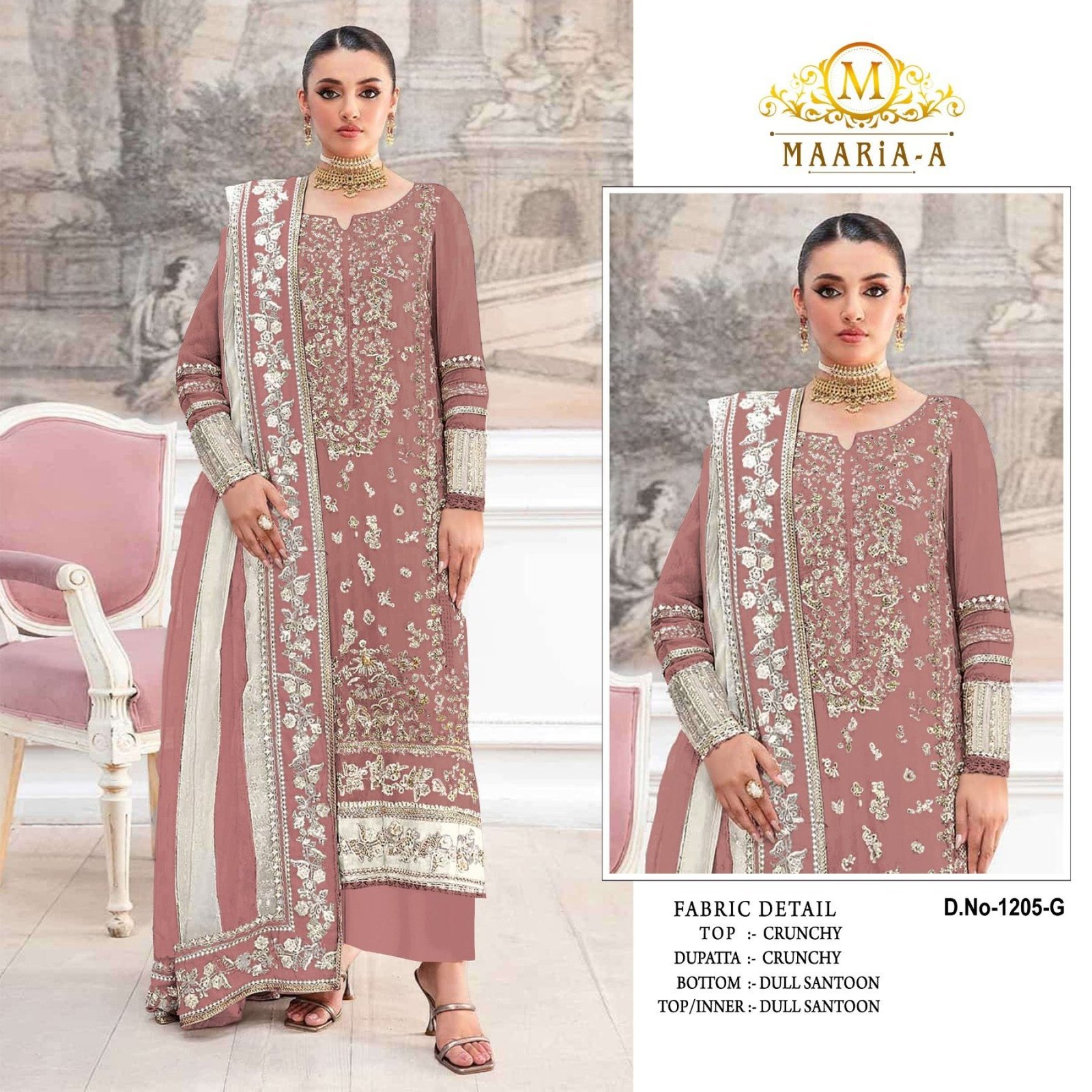 Premium crunchy fabric suit set featuring heavy embroidery sequence and khatli work, paired with santoon bottom and elegant lace dupatta. Available in material and readymade options, perfect for wedding, festive, and party wear.