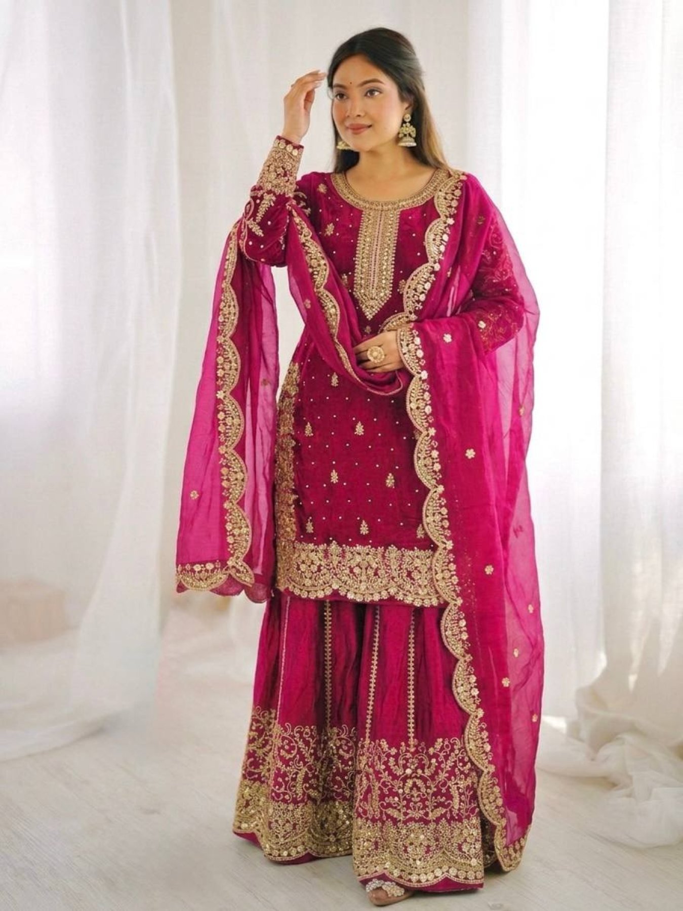Export Quality Pink Designer Suit Set With Silk Palazzo for Boutique Collection