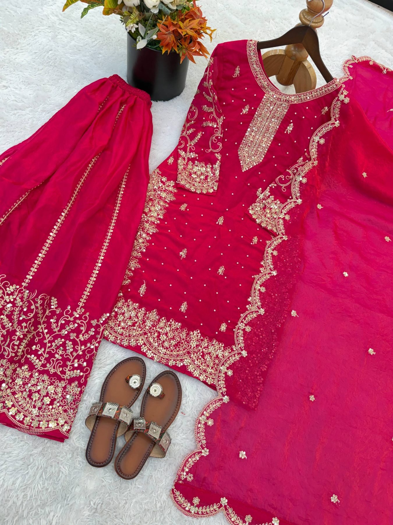 Premium Fendy silk palazzo suit set featuring elegant coding embroidery and sequins work. Comes with matching palazzo and designer dupatta with lace border, perfect for festive and wedding wear.