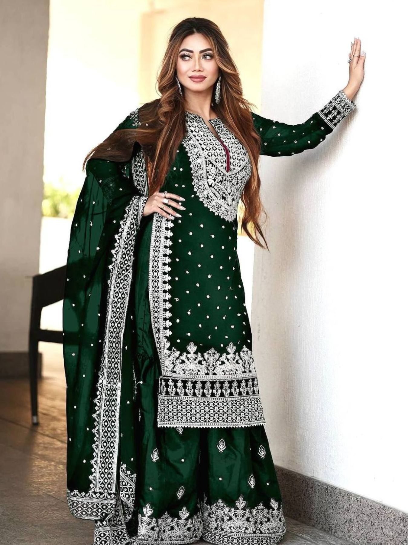Embrace elegance with this stunning Faux Georgette Gharara Set. Featuring intricate embroidery sequence work and a luxurious feel, this set is perfect for weddings, festive occasions, or any special celebration.