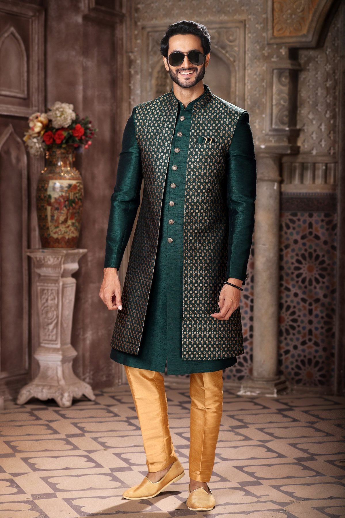 Premium 3 piece indo western jacket set crafted in art silk, velvet and banarasi jacquard fabrics with multiple designer variants. Comes with stylish jacket, kurta and aligarhi pant, perfect for wedding and festive wear.