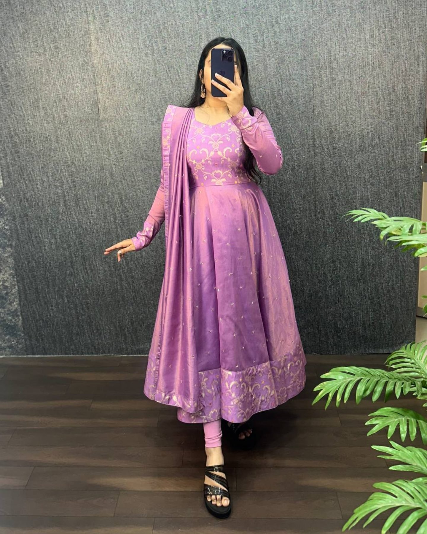 Eye Catching Lavender Two Tone Banarasi Gown with Sequence Work Dupatta for Boutiques Buyers