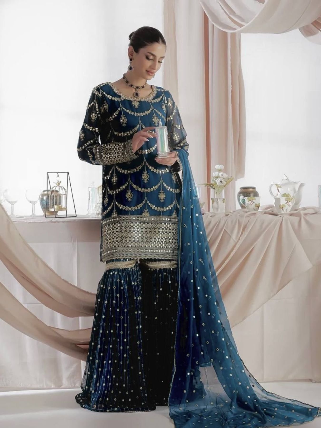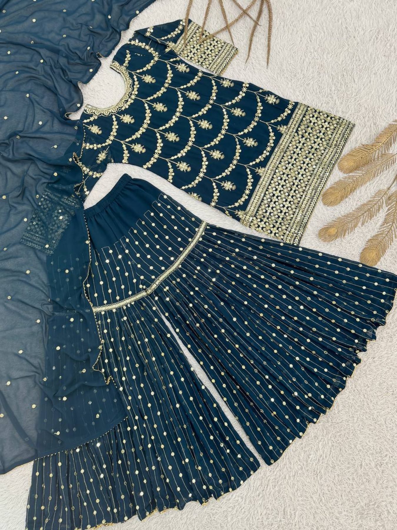Elevate your festive wardrobe with this beautifully embroidered faux georgette sharara set.