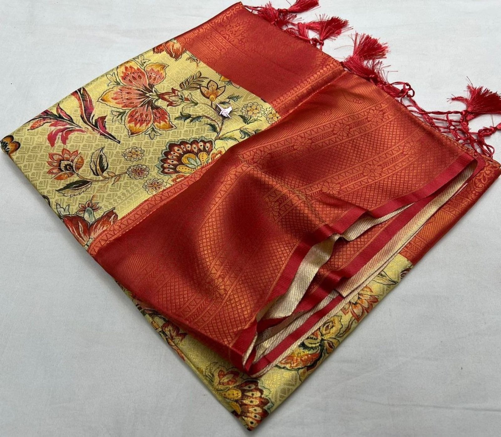 FABULOUS SOFT SILK FABRIC WITH FLORAL DIGITAL PRINT N GOLD JARI N CONTRAST BORDER N RICH GRAND PALLU