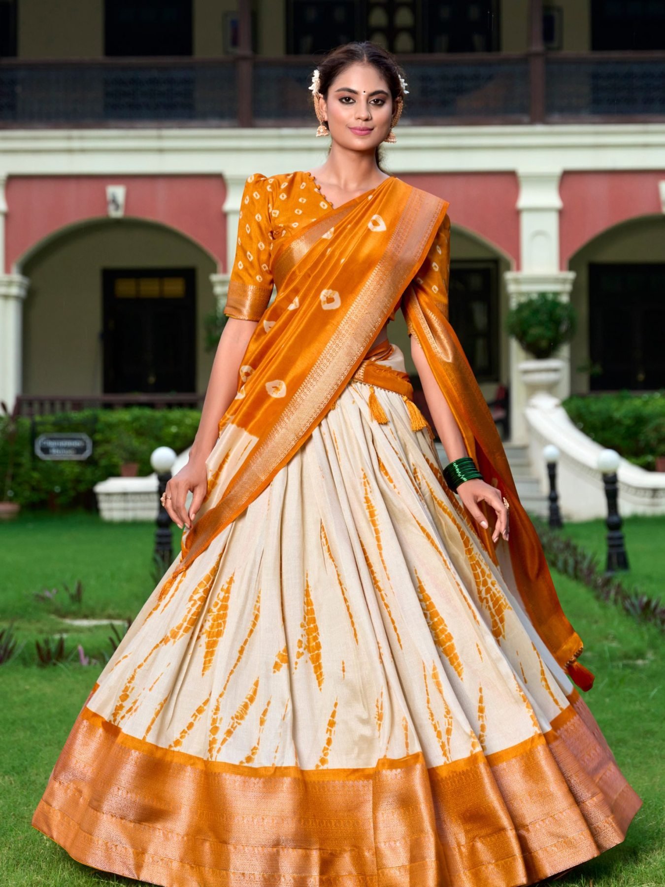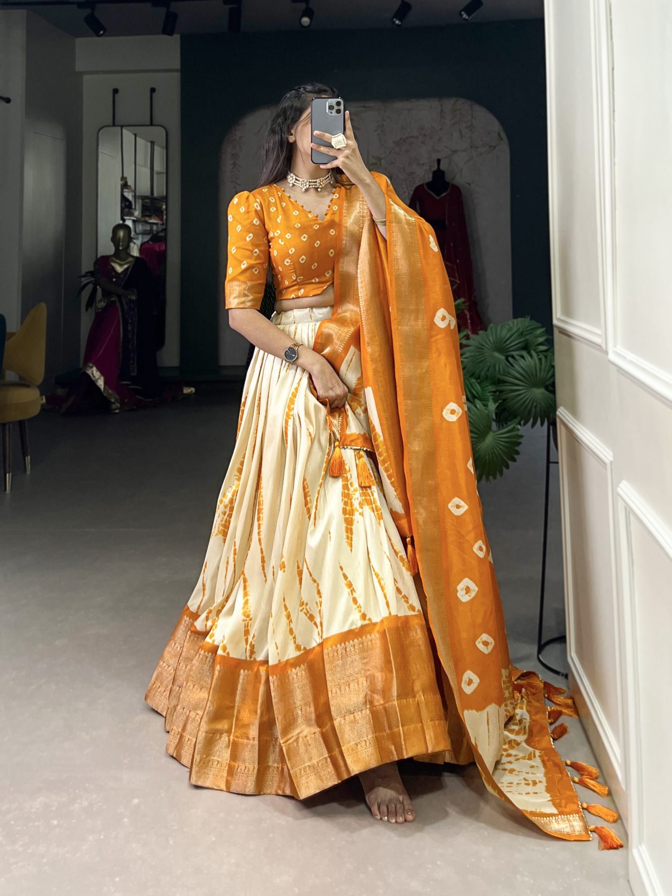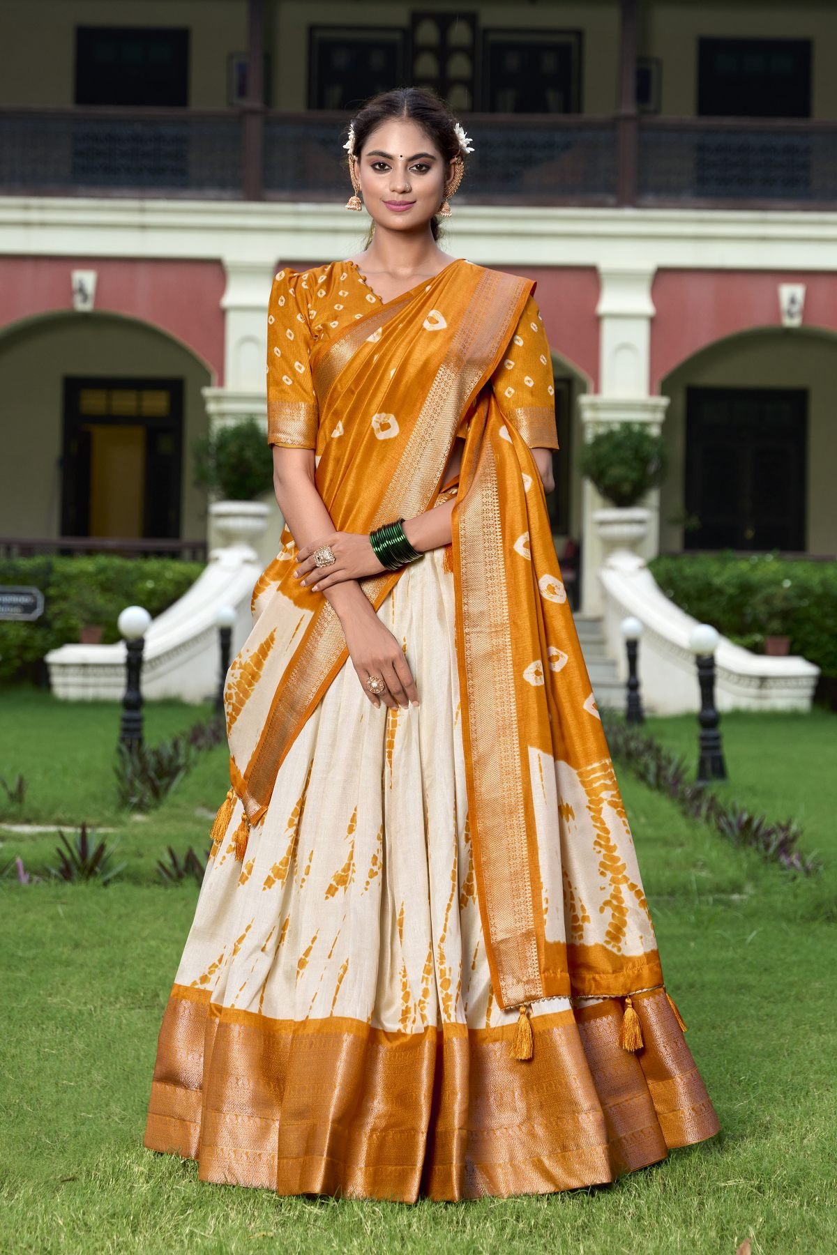 Fantastic Mustered Yellow Color Dola Silk Shikora Print Zari Border Saree Lehenga Choli