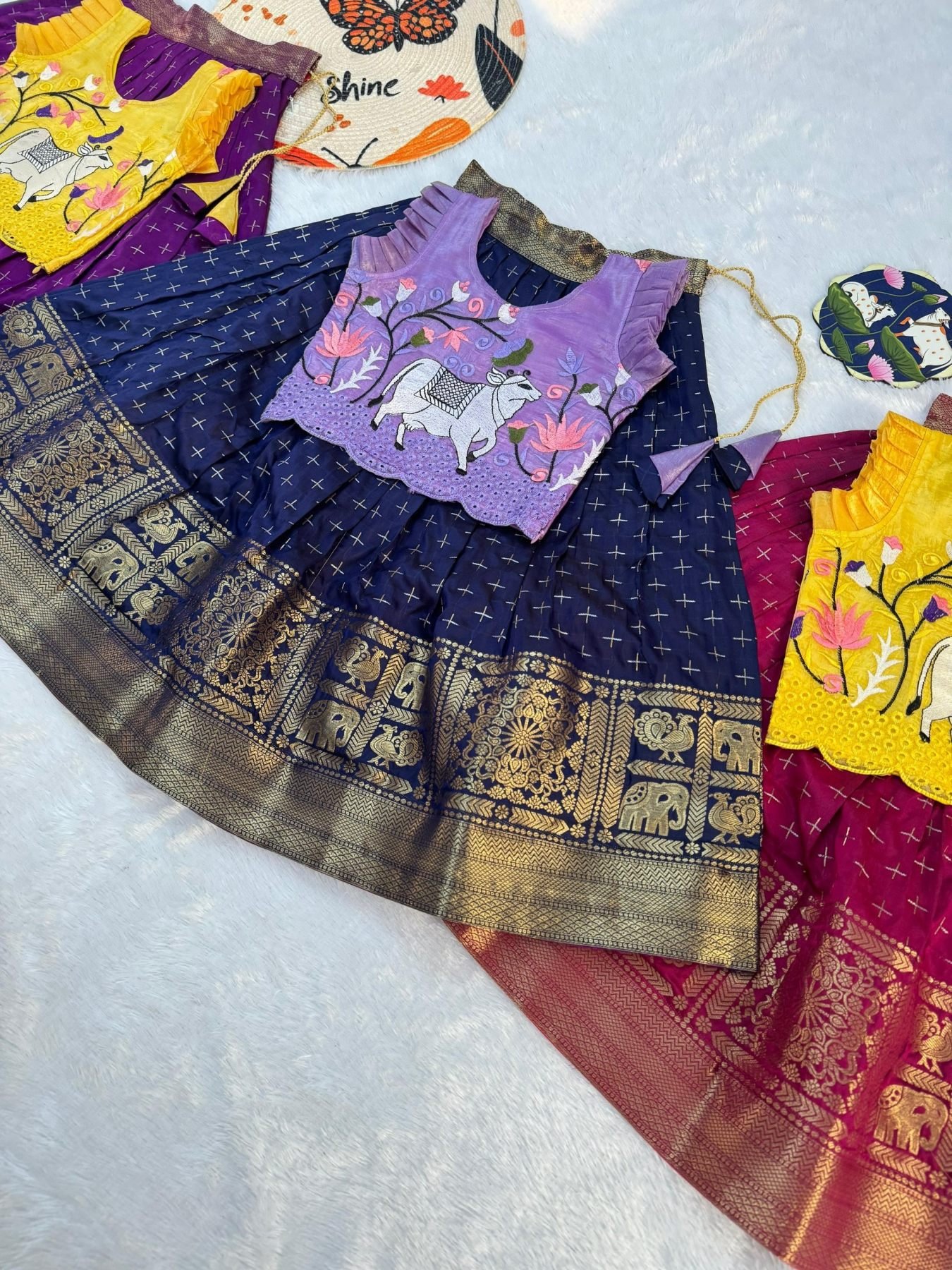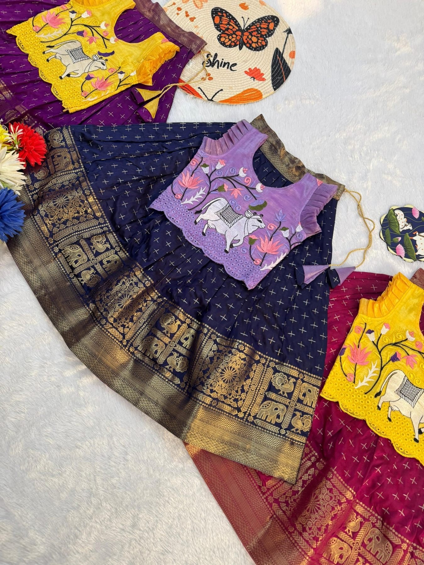 Beautiful kids lehenga set designed with elegant weaving work and jacquard border, paired with a stylish pichwai embroidery blouse. Perfect for weddings, festive wear, and traditional functions.