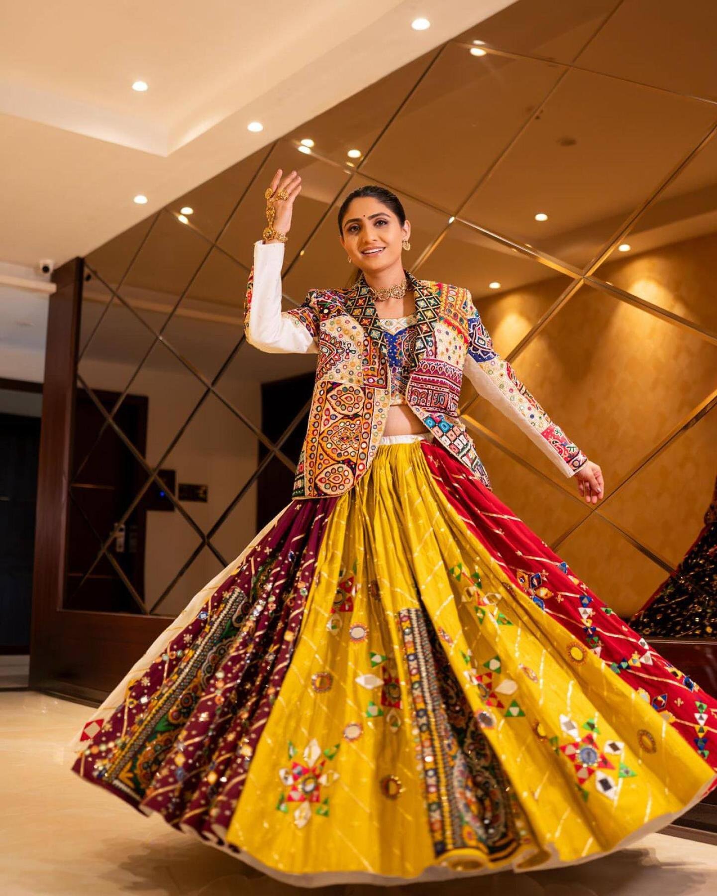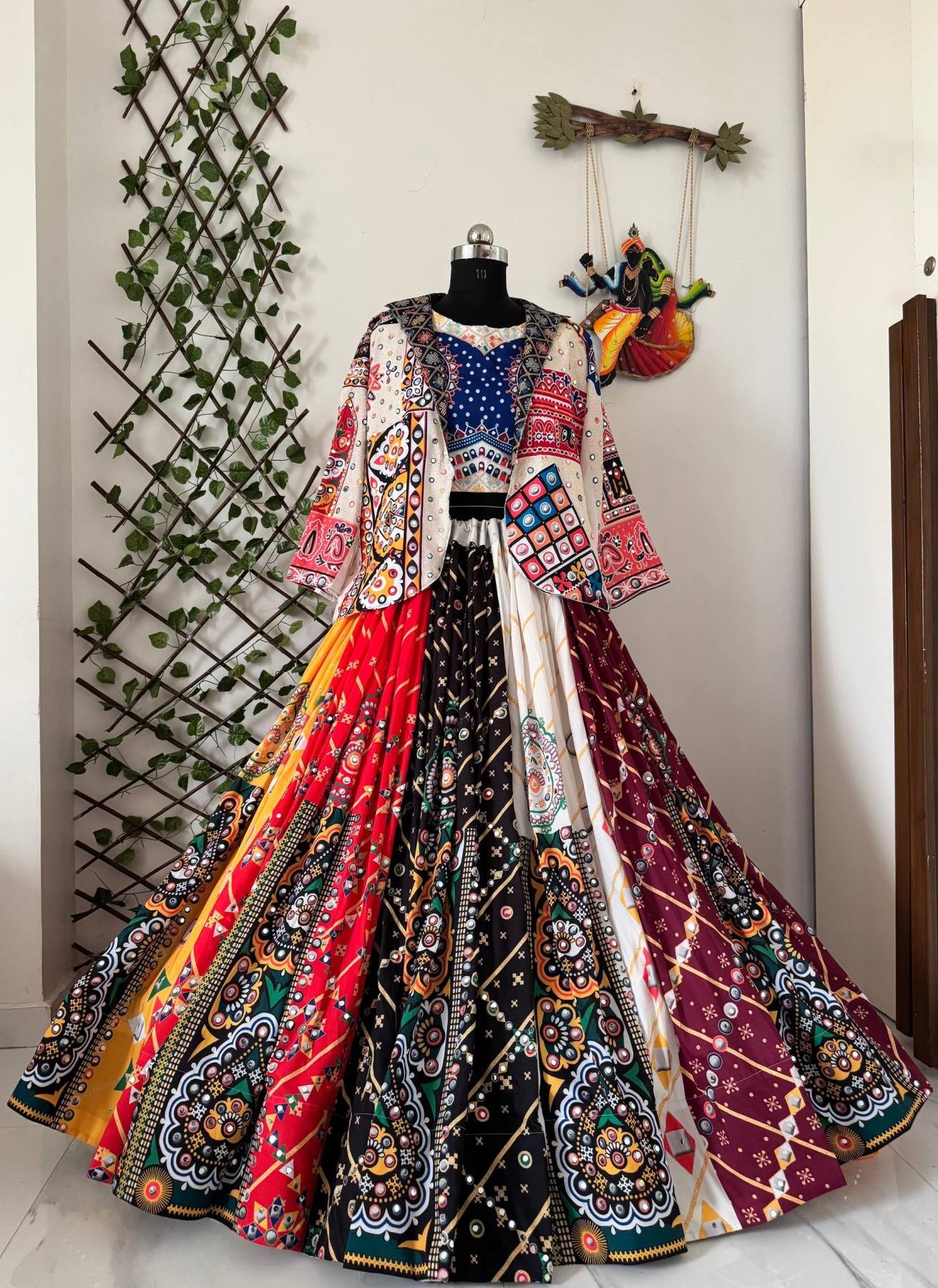 Step into Garba nights with elegance and grace in our Heavy Muslin Cotton Chaniya Choli with Matching Koti. Designed with real mirror work and digital prints, this set is perfect for festive wear and traditional occasions.