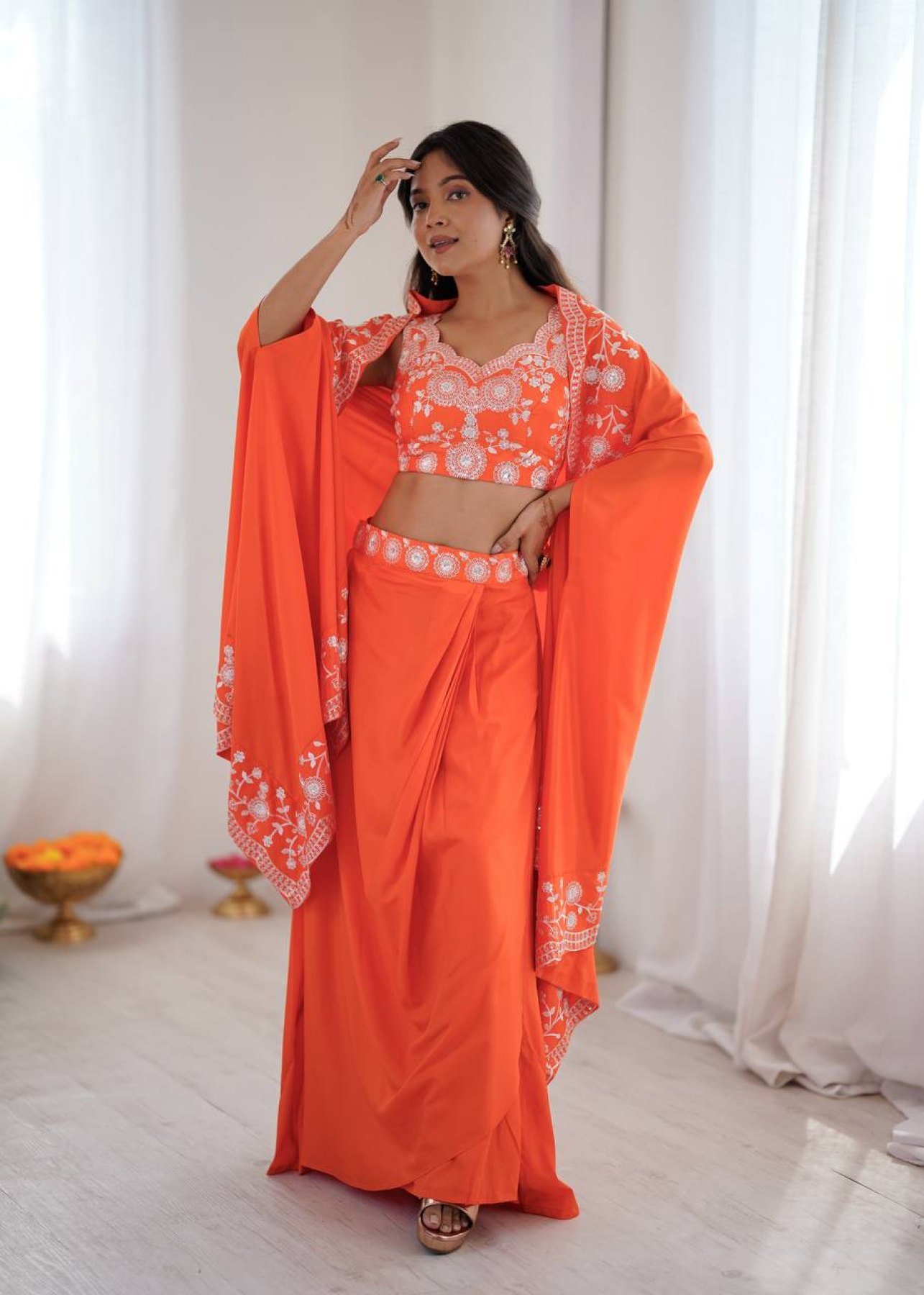 Trendy western dhoti set crafted in premium French crepe fabric featuring elegant thread and sequence work. Paired with a stylish shrug and matching choli, this fusion outfit is perfect for festive wear, parties, and modern ethnic styling.
