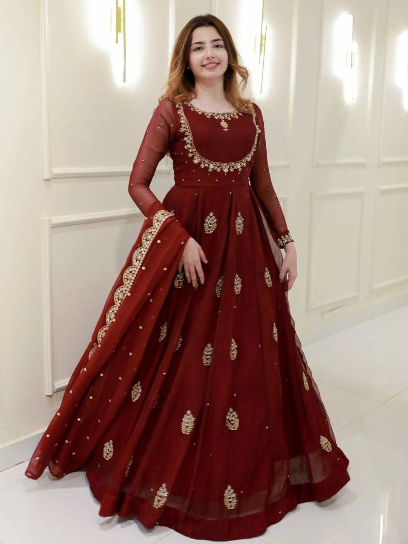 Elegant georgette long gown designed with premium sequence embroidery for a rich festive appeal.