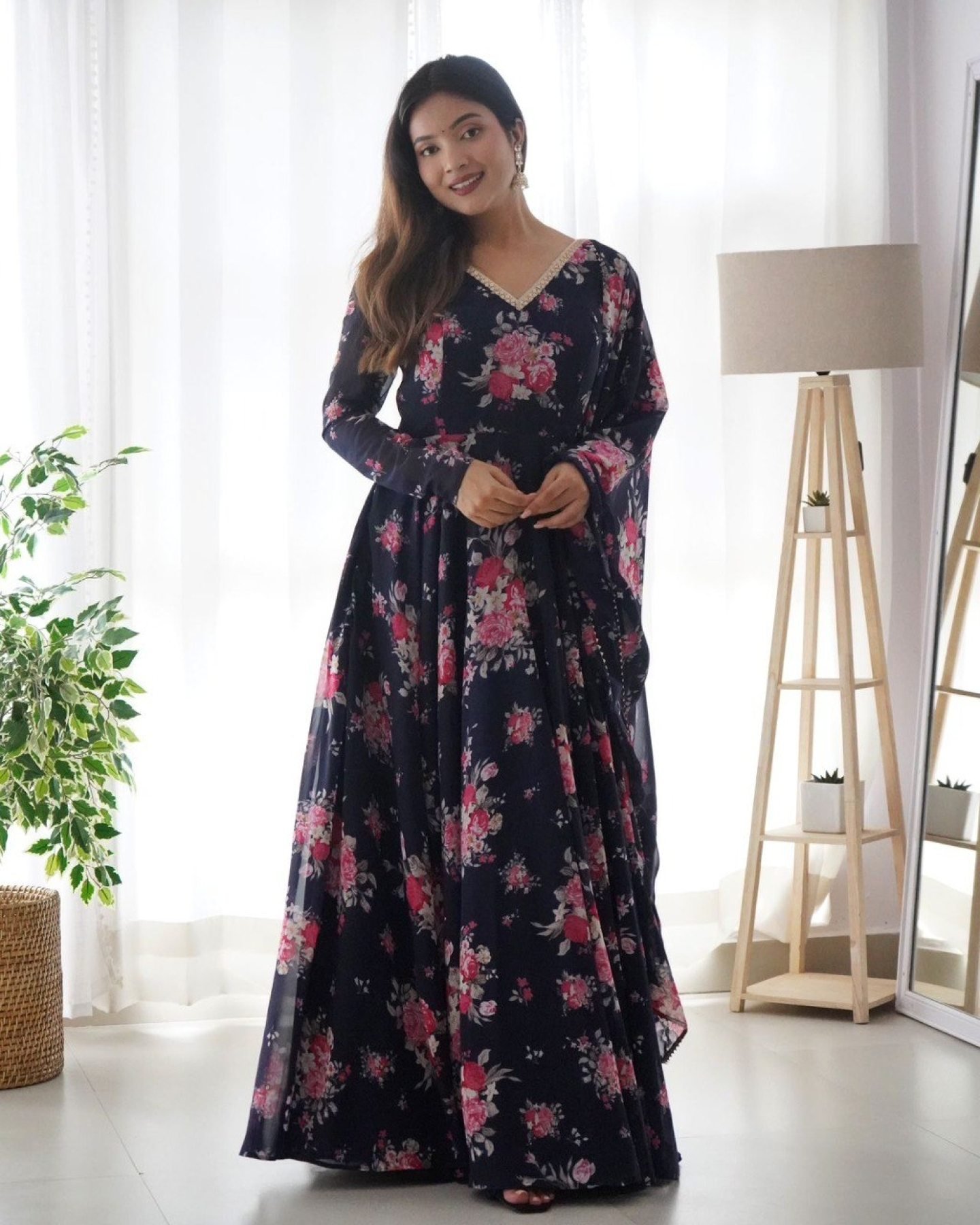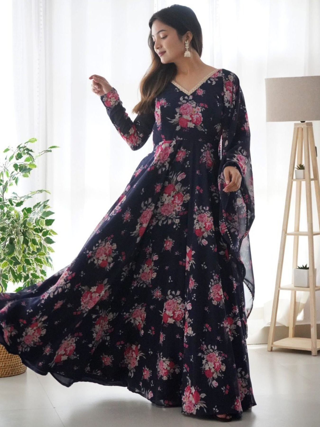 Floral Printed Soft Georgette Kurti & Dupatta With Fancy Lace Work