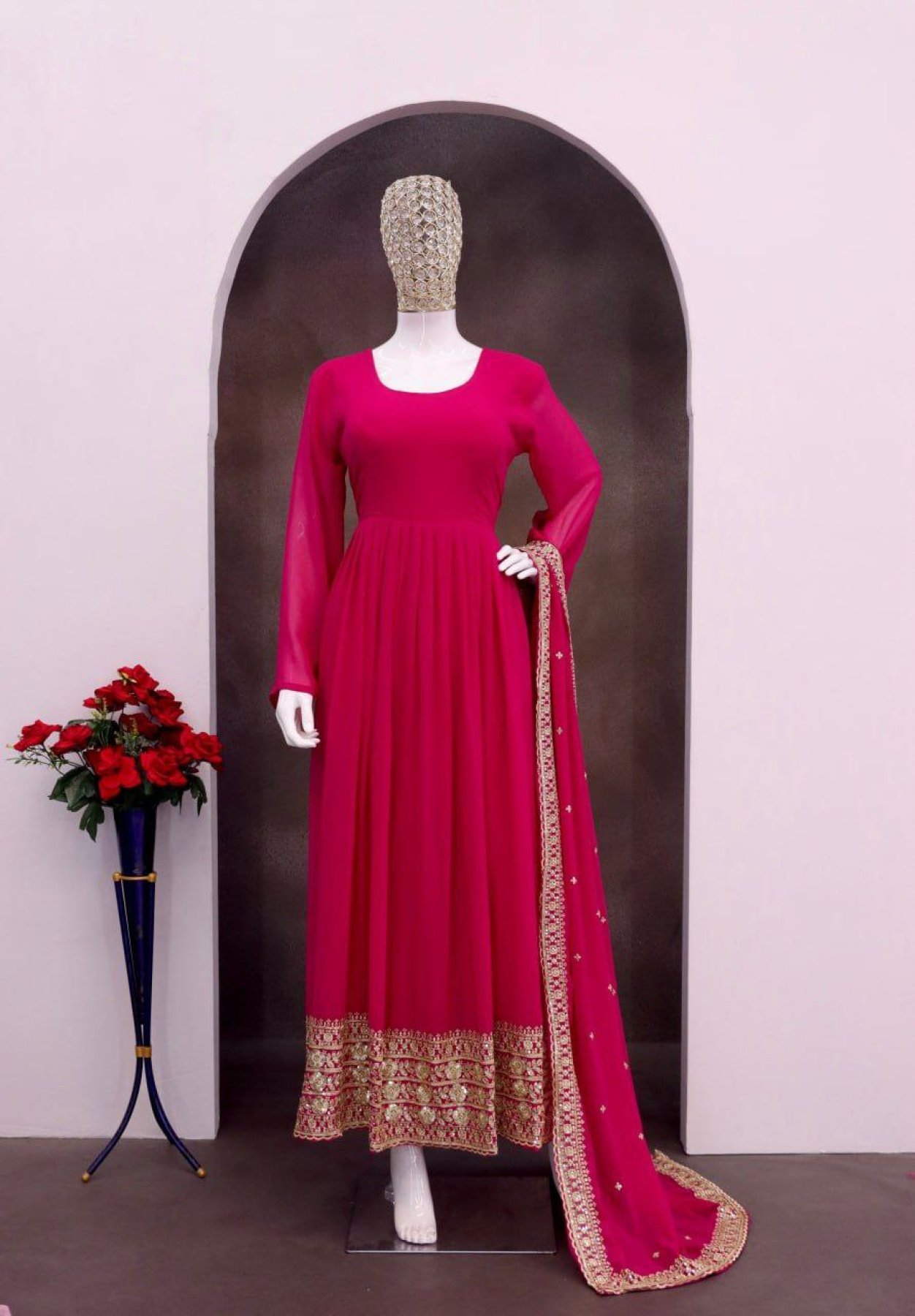 Fresh Pink Round Neck Georgette Anarkali Gown Set with Dupatta for Wedding Wear