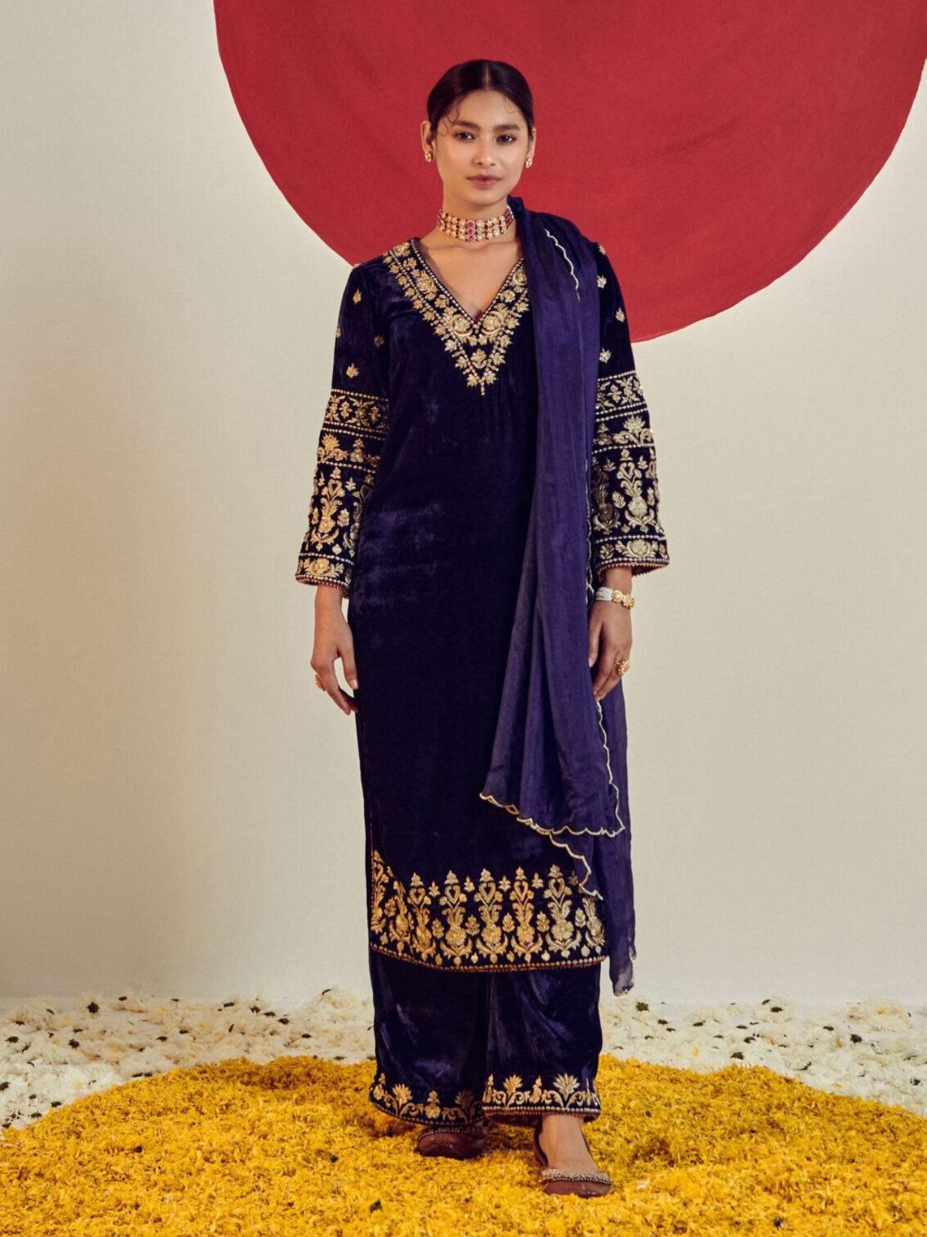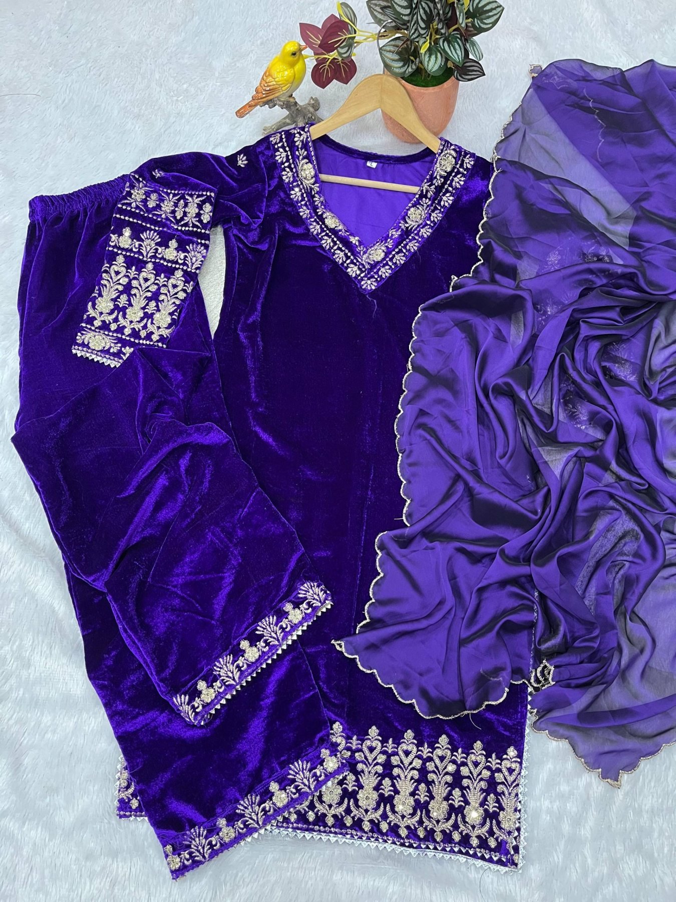 Fresh Velvet V Neck Embroidered Zari Sequin Top Palazzo Set with Dupatta for Resellers