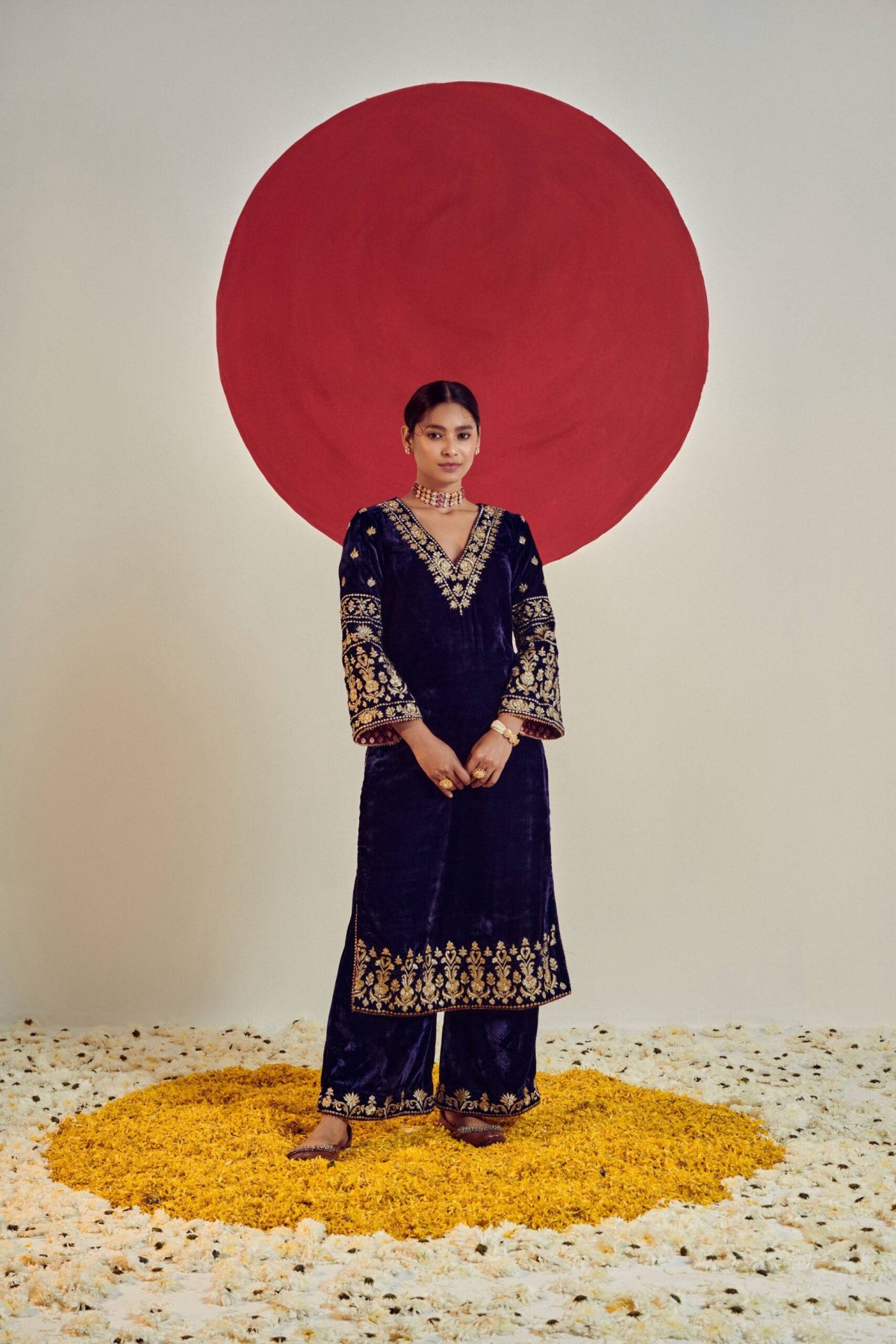 This premium 9000 velvet top palazzo set showcases rich zari, dori and dual-size sequin embroidery with stylish side slits and a V-neck design. Paired with a graceful rangoli silk dupatta finished with zari arko work. A refined choice for festive and party wear collections.