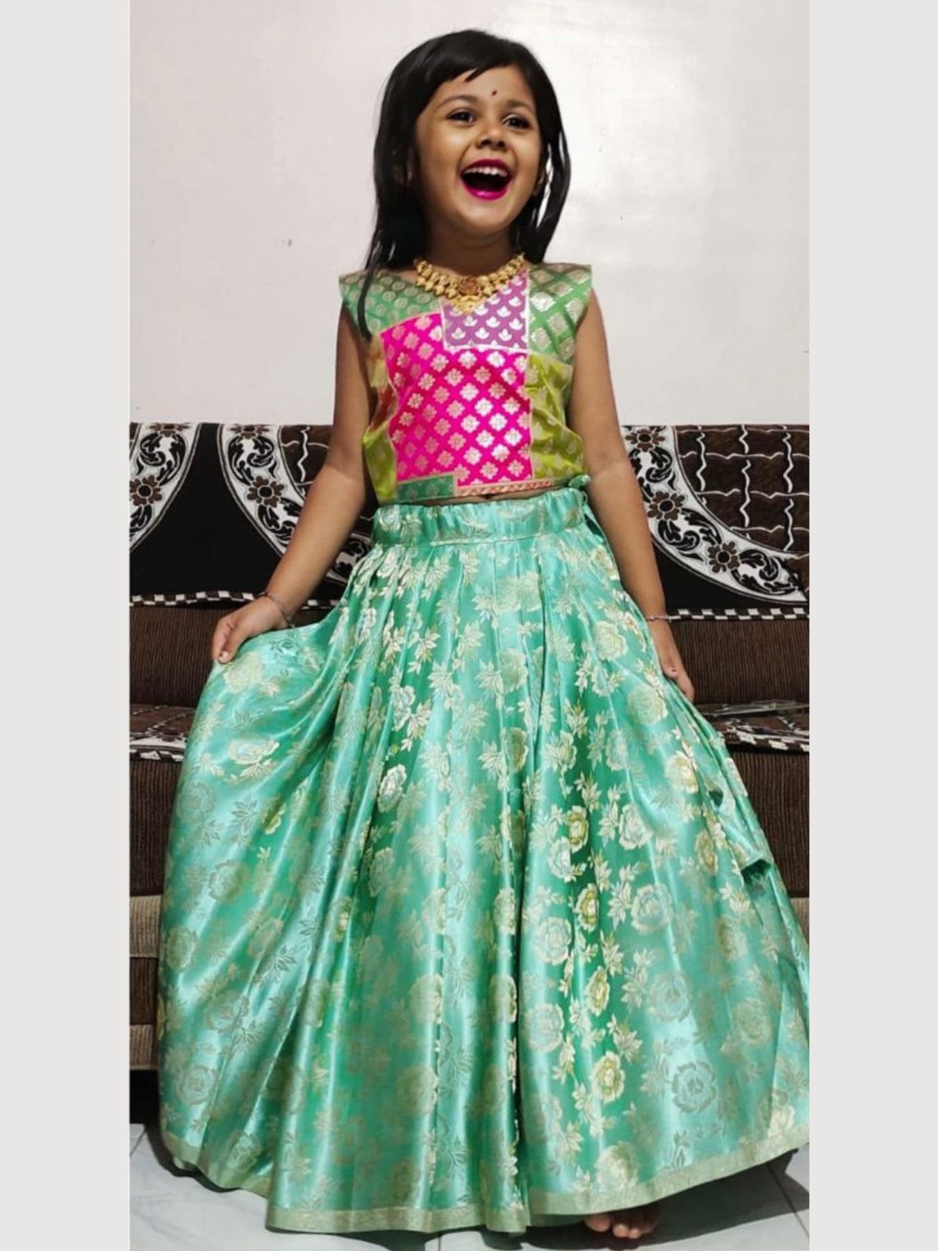 Premium kids lehenga set made from pure silk fabric with full flair and zari weaving, exactly as shown in the picture. Fully stitched blouse and lehenga with canvas finish and soft crape lining ensure maximum comfort and elegance. Available in a wide age range from 6 months to 15 years, tailored to proper chest, waist, and height sizes.