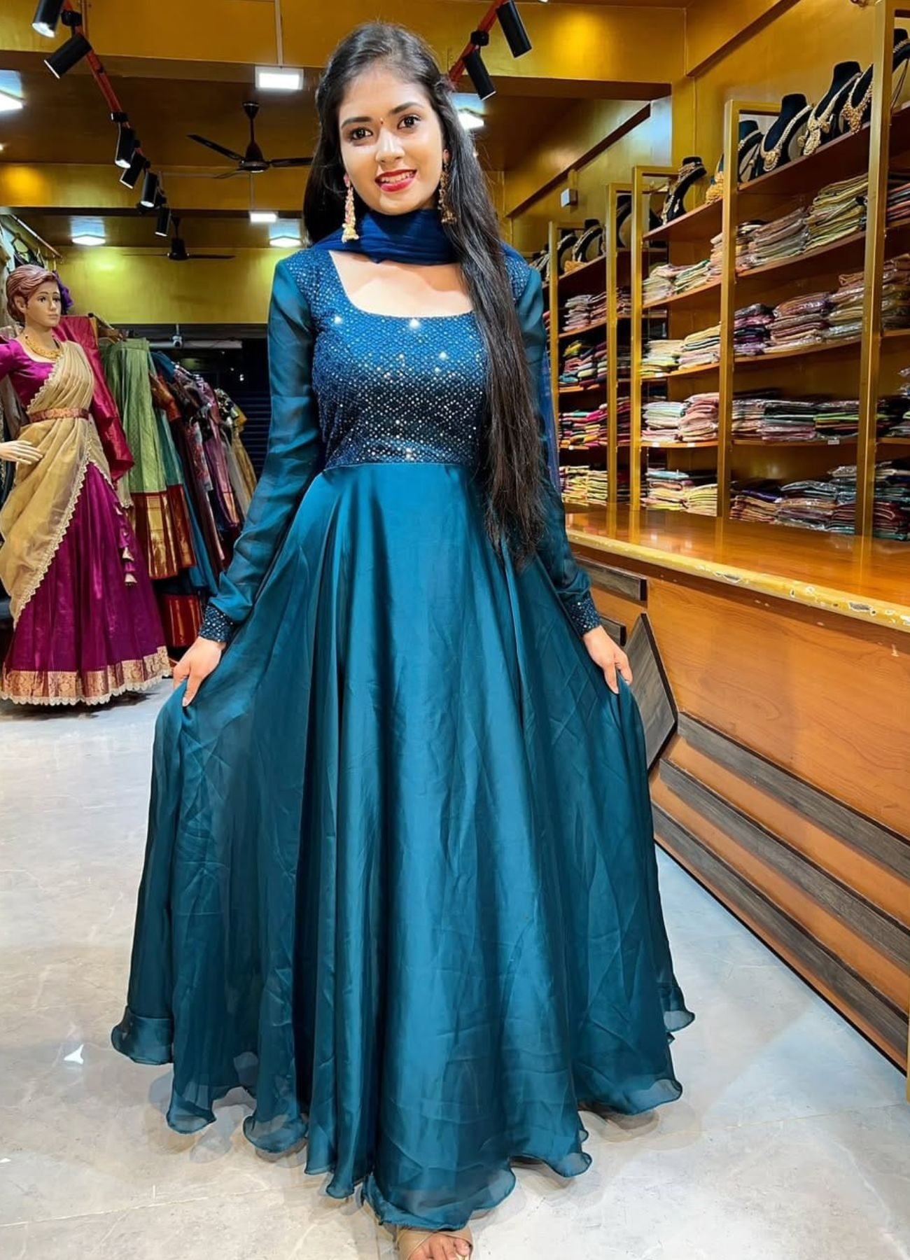Stay effortlessly beautiful in this premium sparkling georgette Anarkali, beautifully enhanced with elegant monochrome embroidery on the yoke.Designed with a 4-meter graceful flare, full lining, and paired with a matching dupatta for a complete festive look.