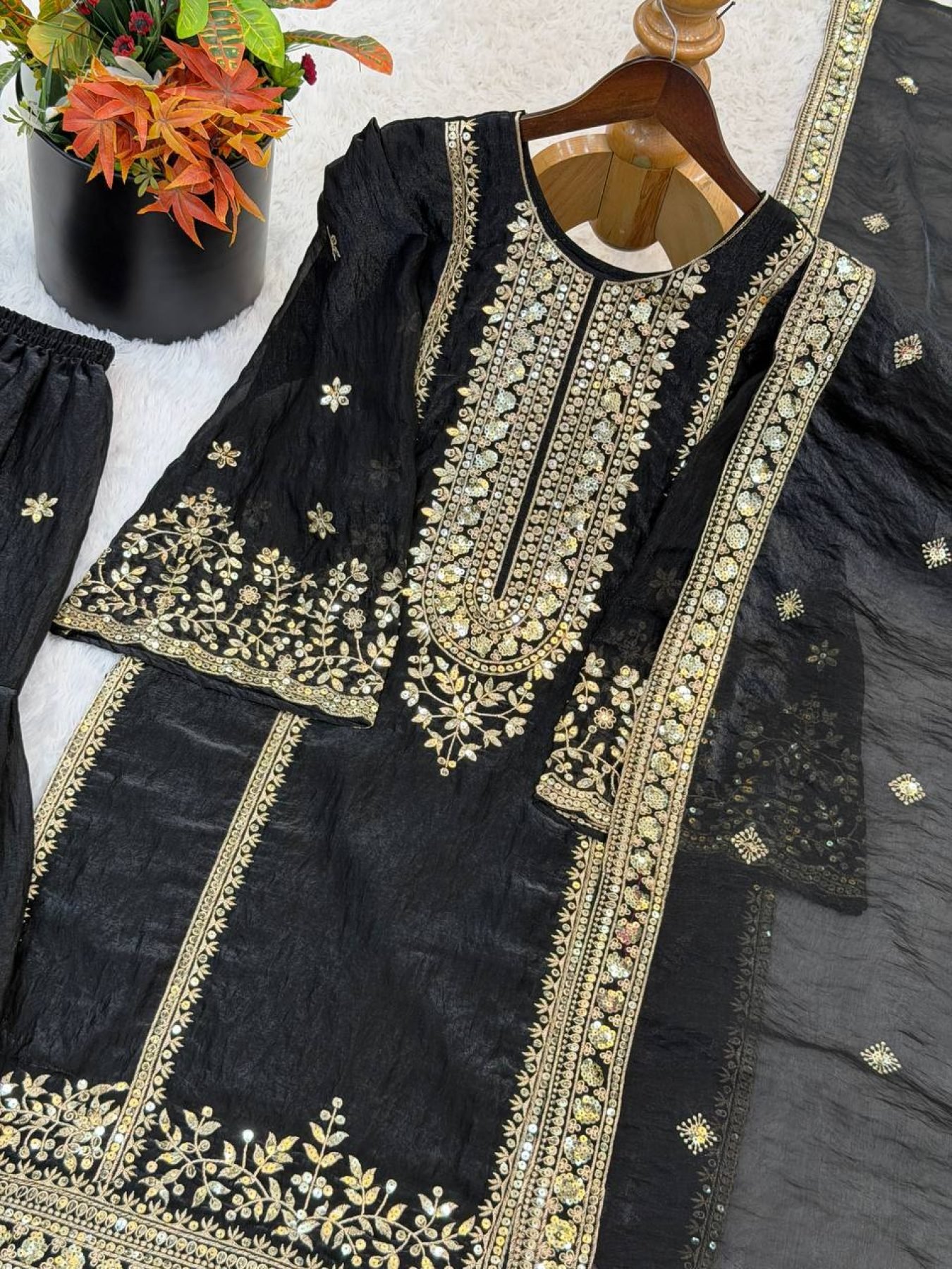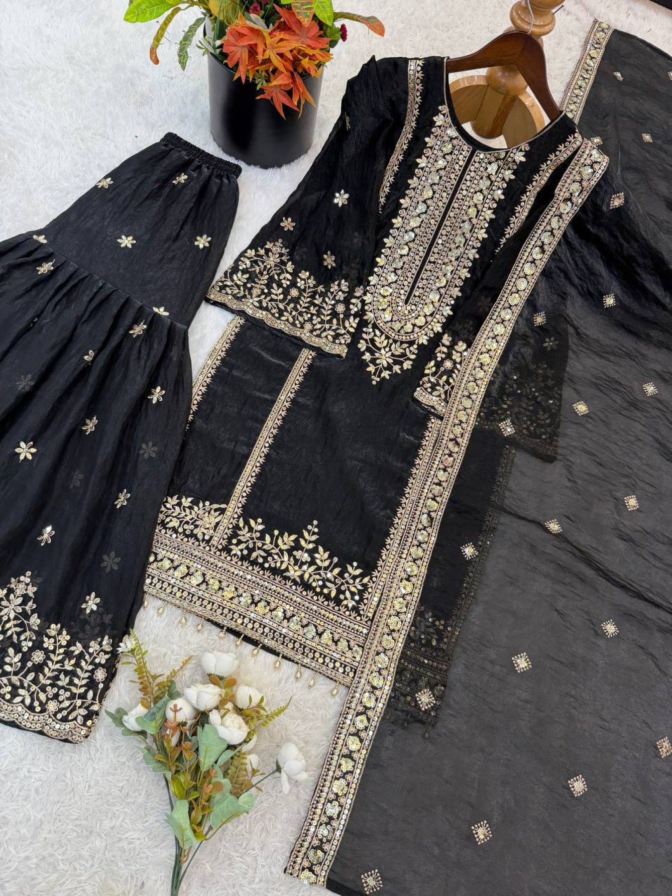 Glamorous Black Heavy Fendy Silk Embroidered Sequence Work Sharara Set