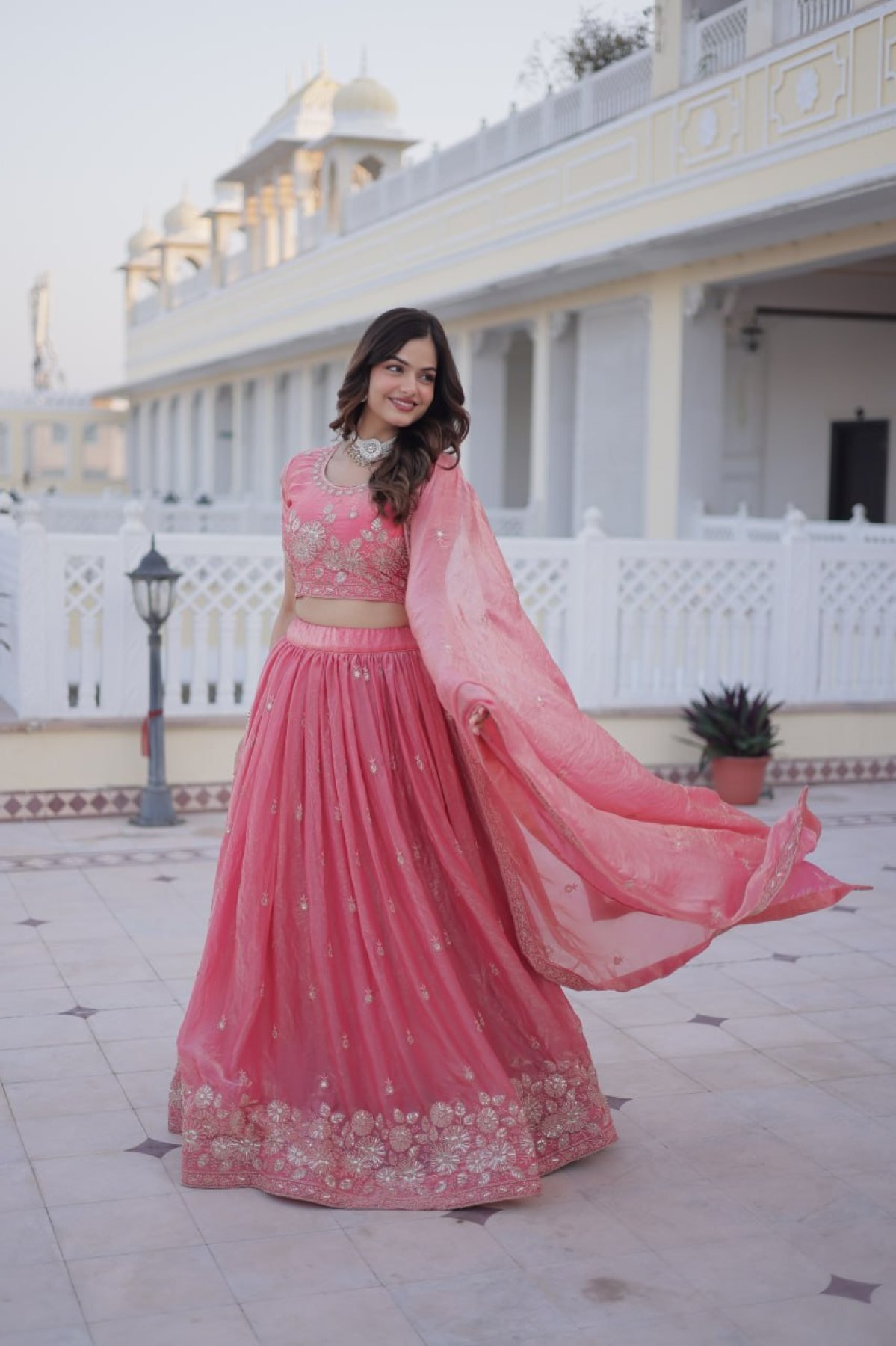 Glamorous Pink Fendi Silk Lehenga Choli Heavy Sequins And Zari Embroidery