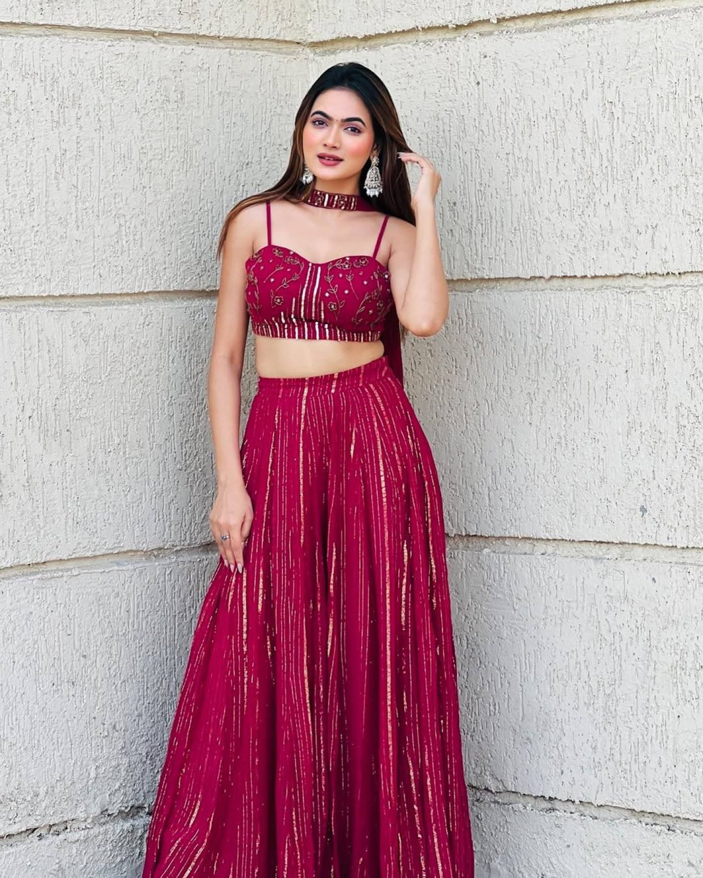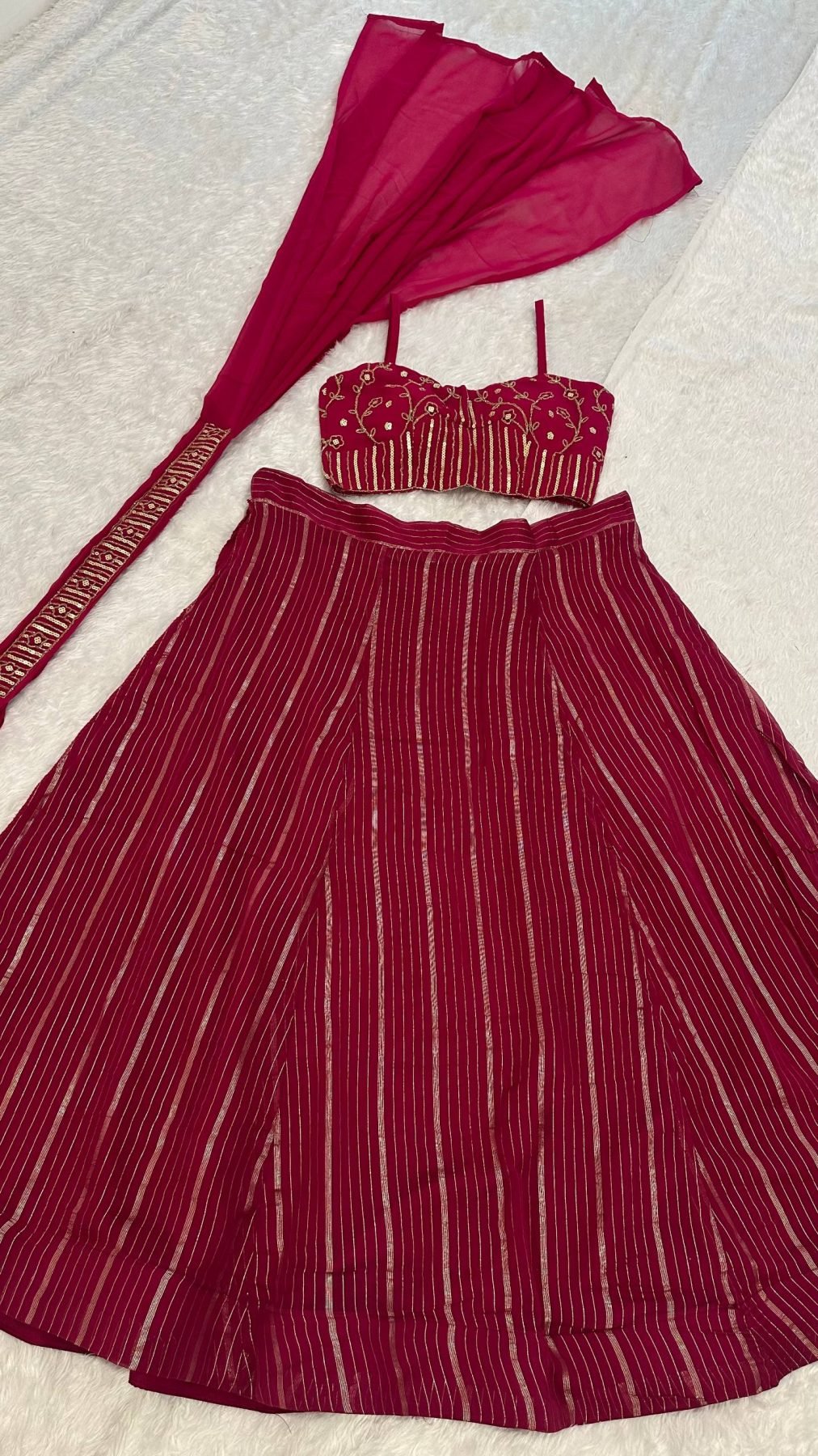 Elegant georgette lehenga set with 3.5 meter flair, paired with sequins and dori work blouse and stylish choker dupatta. Ideal for festive and wedding occasions.