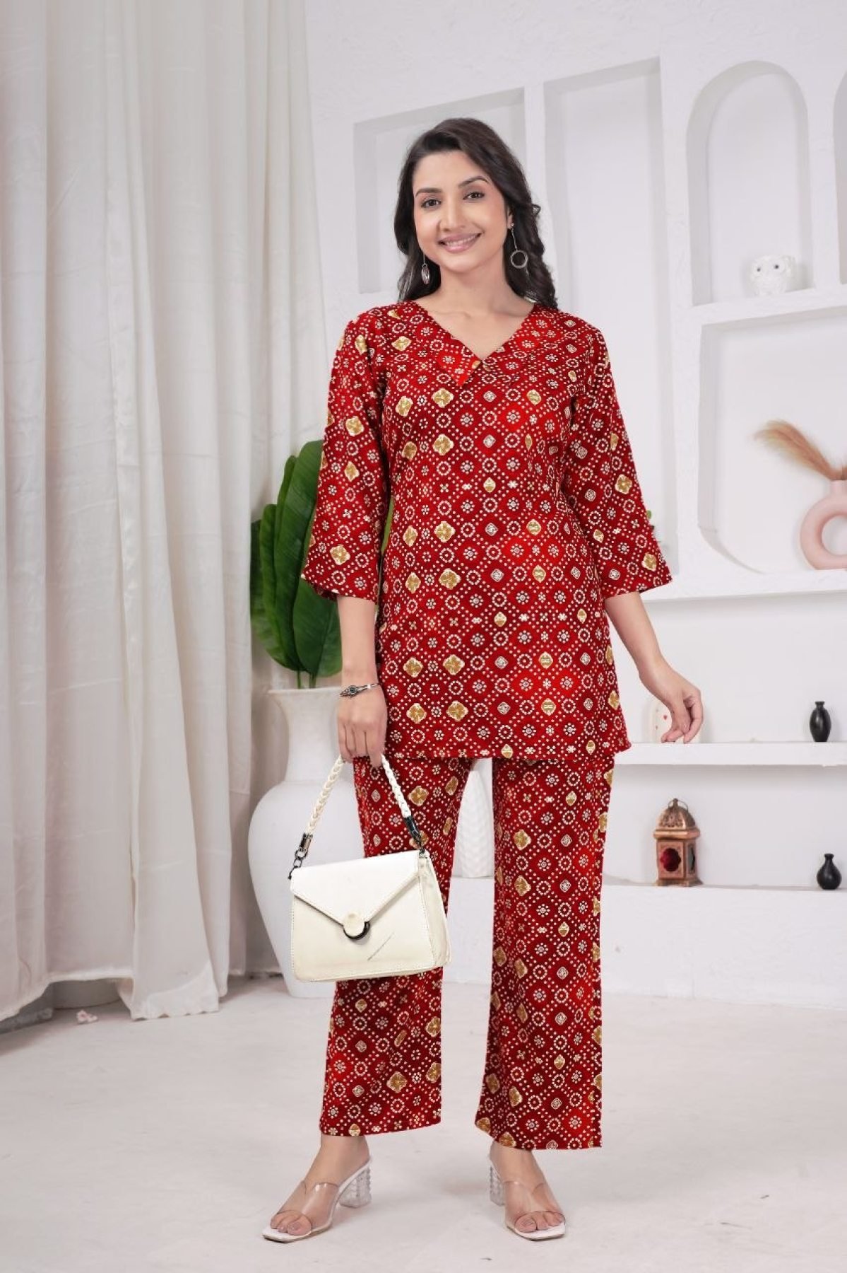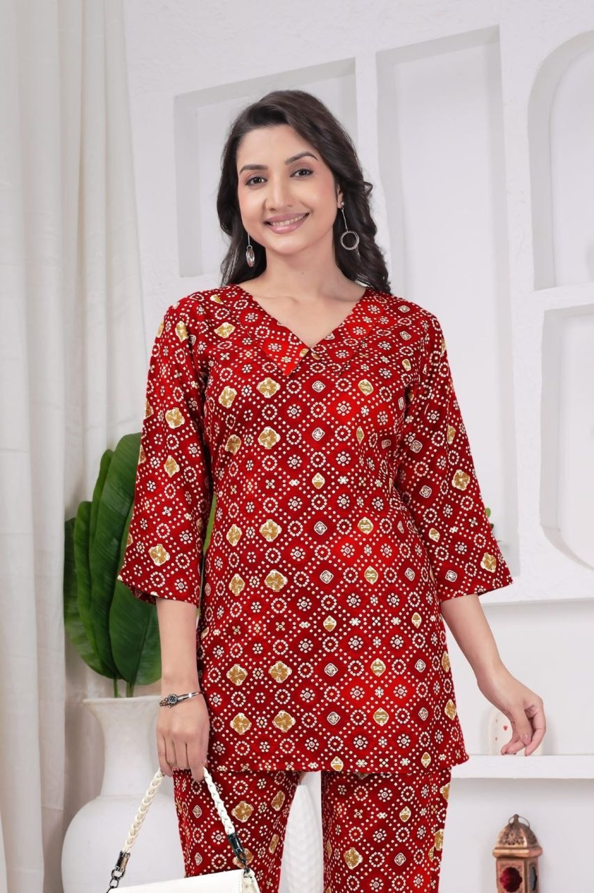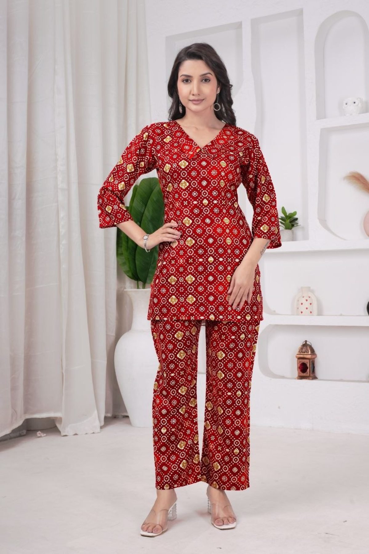 Stylish teal co-ord set crafted in pure rayon viscose featuring elegant Bandhani-inspired prints. Designed with a flattering V-neck kurti and straight-fit trousers, this outfit offers a perfect blend of comfort and Indo-western style, ideal for daily wear, office wear, and casual outings.