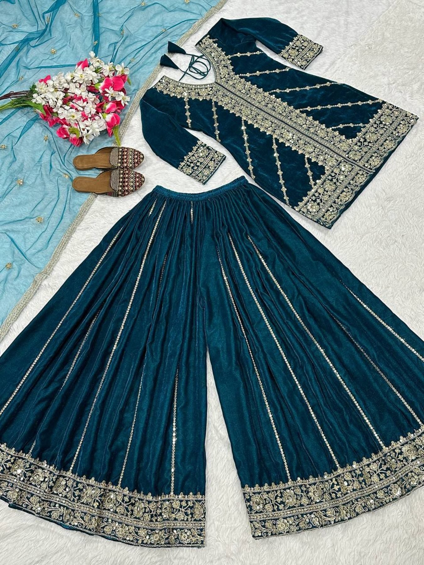 Glittering Winter Wear Velvet Sharara Palazzo Set with Butterfly Net Dupatta for Luxurious Festive Look