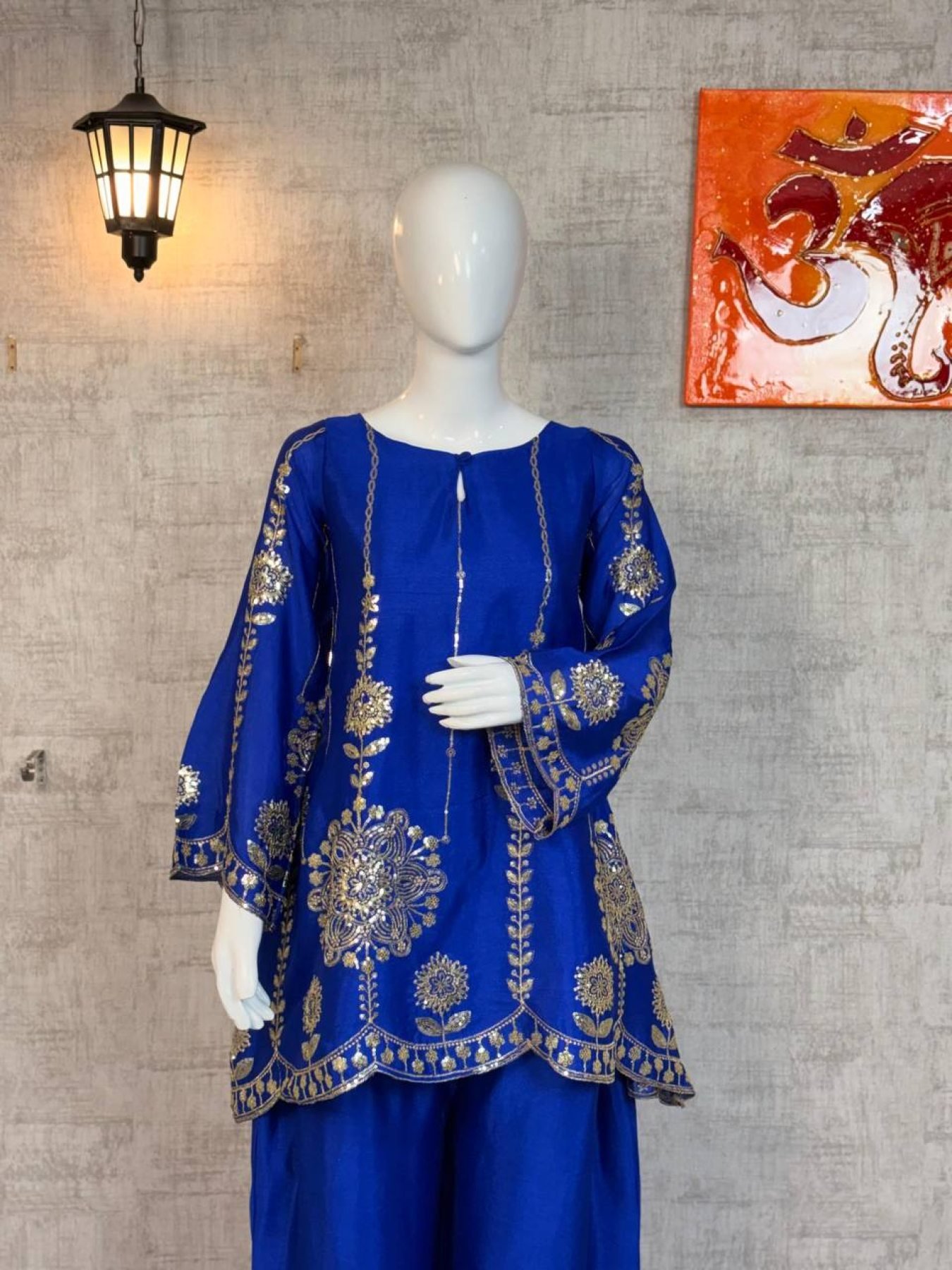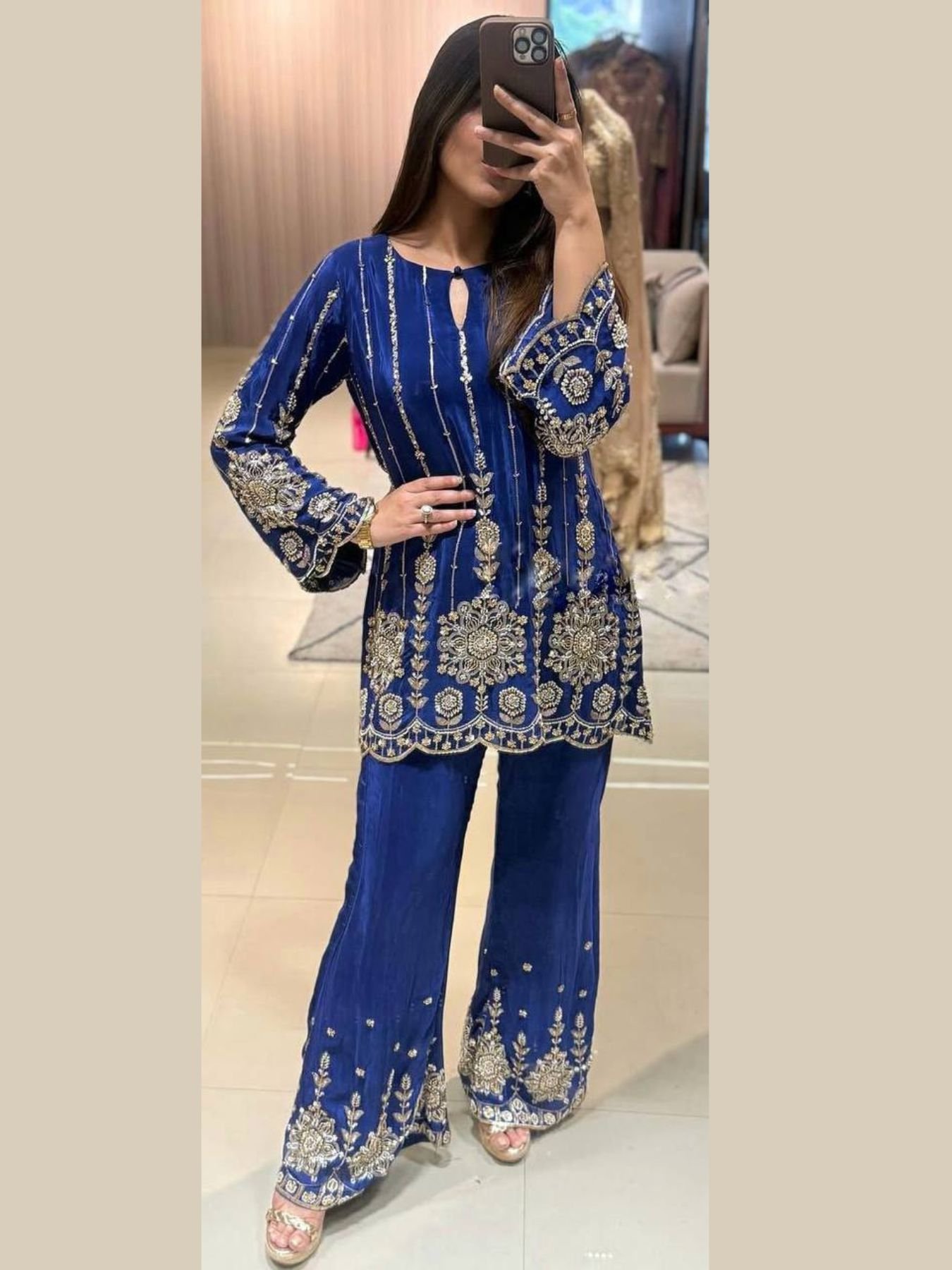Elegant Chinon Silk co-ord set featuring rich embroidery and sequins work for a premium festive look.