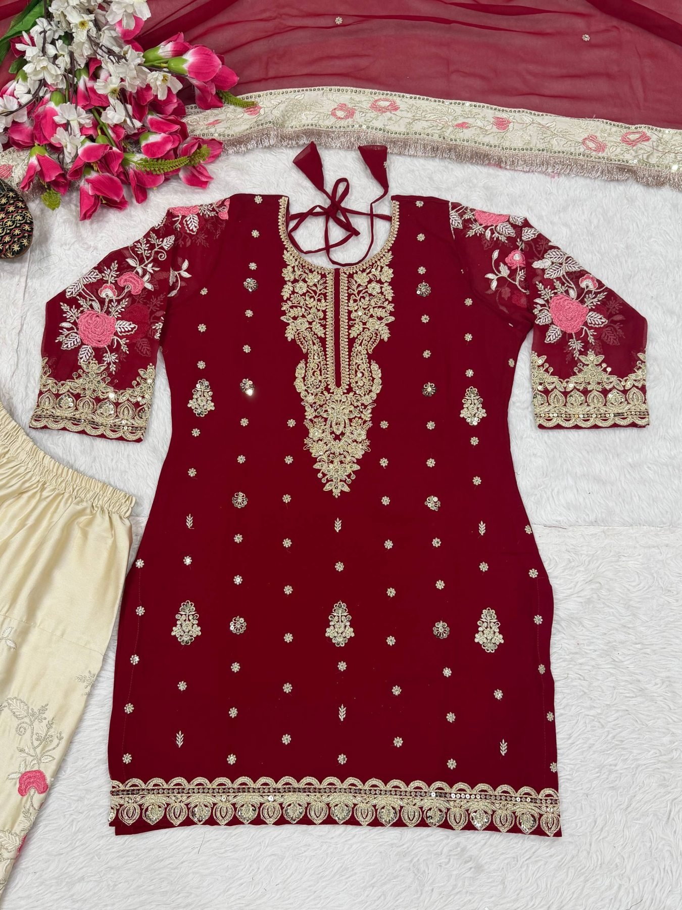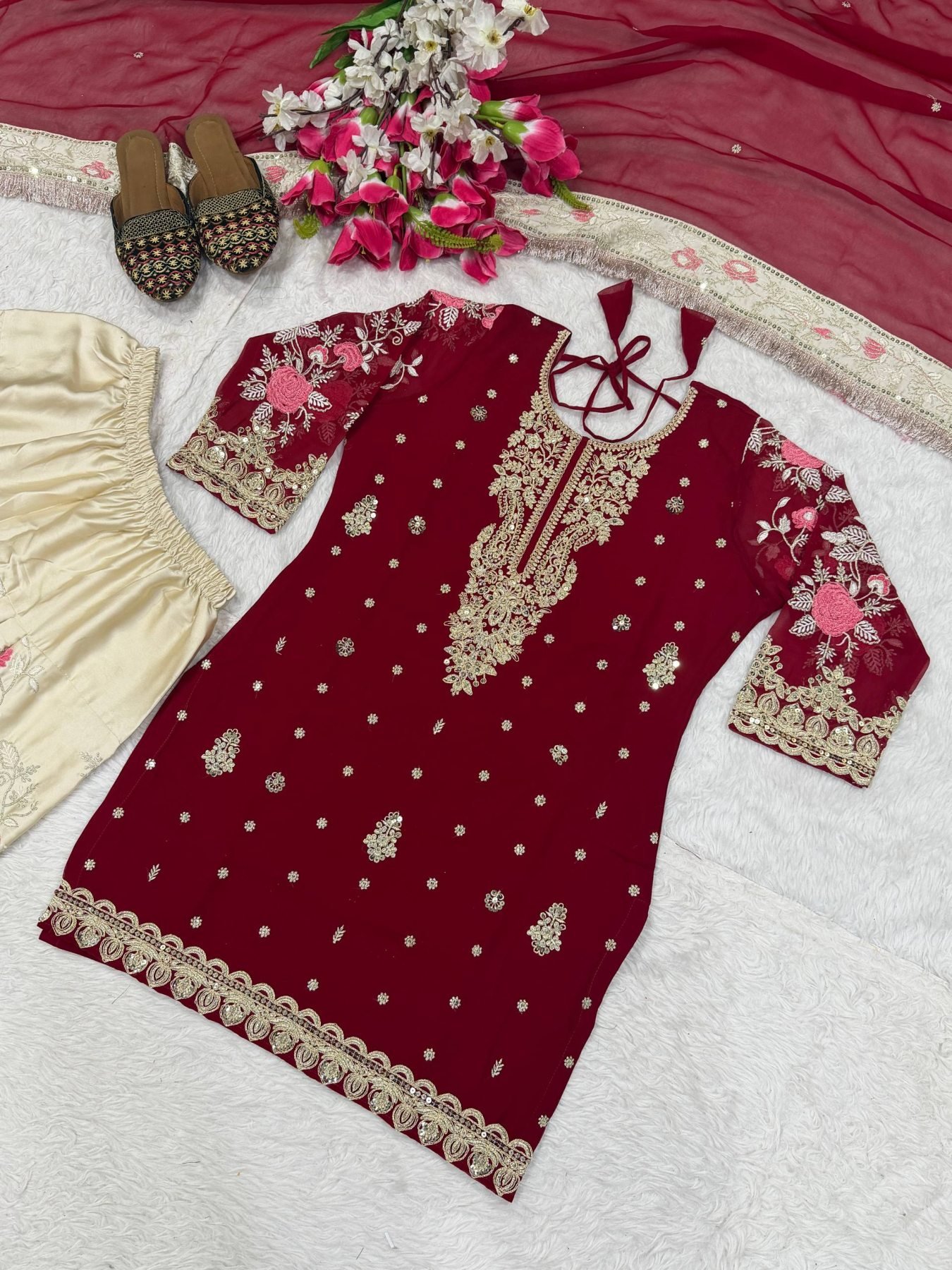 Gorgeous Maroon Faux Georgette Embroidered Kurti with Embroidery 5mm Sequence Work Patiyala Salwar and Dupatta Set