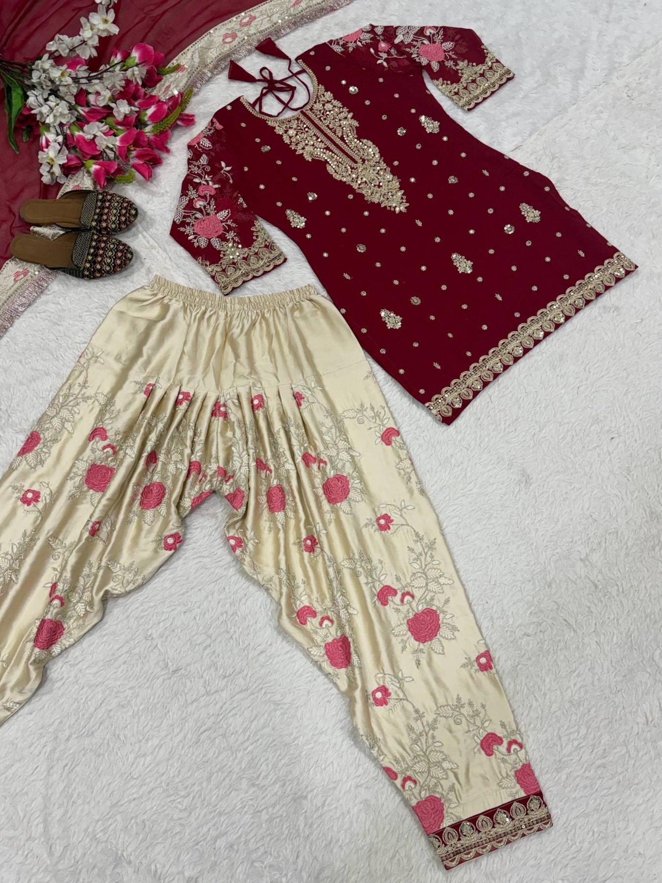 Suit set crafted in premium fabrics with detailed embroidery work. The outfit features a fully stitched faux georgette top with 5mm sequence embroidery, a stylish patiyala salwar in japan satin, and a matching georgette dupatta with embroidery detailing. Perfect for festive occasions, parties, and traditional wear.