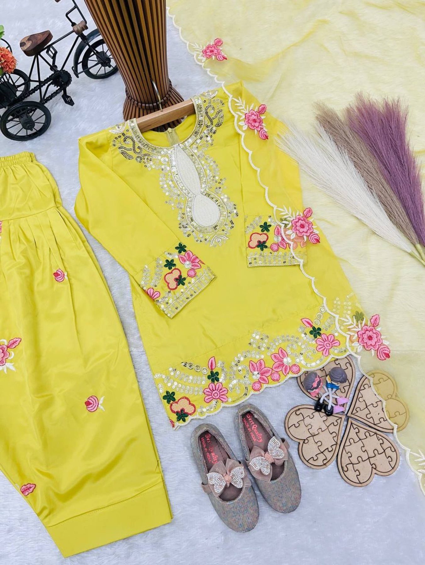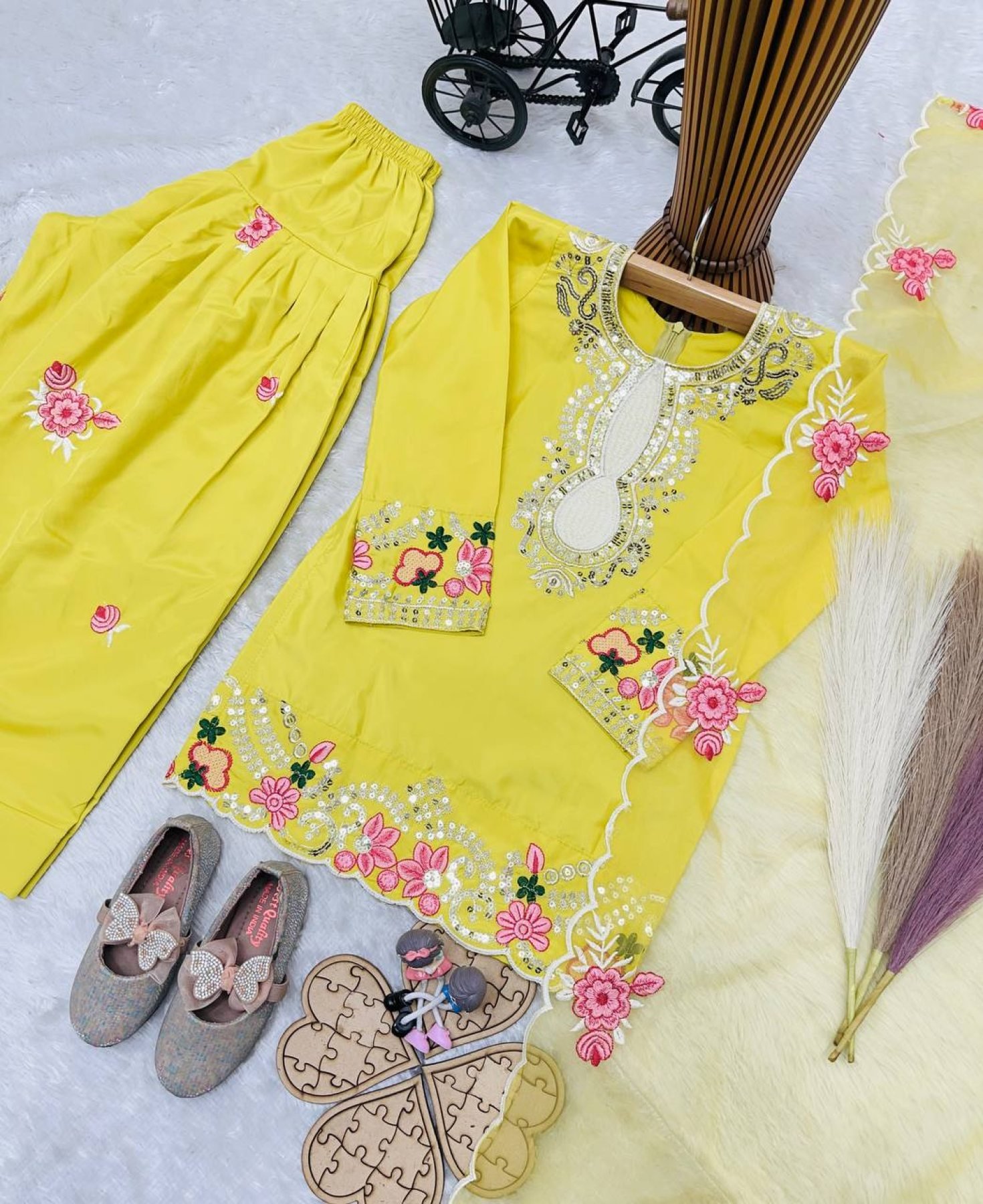 Gorgeous Yellow Kids Crepe Embroidered Salwar Suit Set with Organza Dupatta