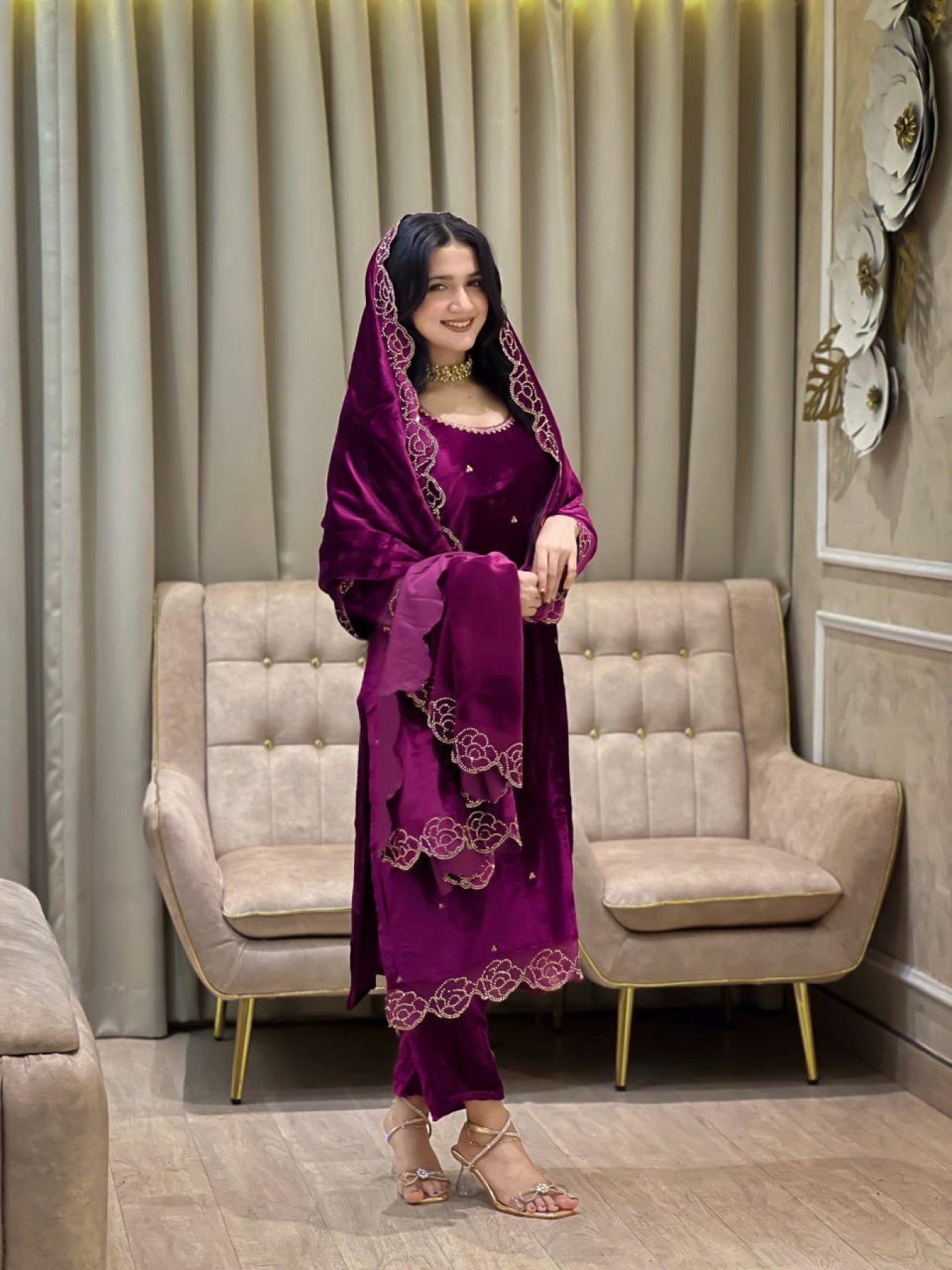 Luxurious pure viscose velvet suit set crafted with heavy rhinestone (zarkhan) and sequence embroidery for a premium festive look.