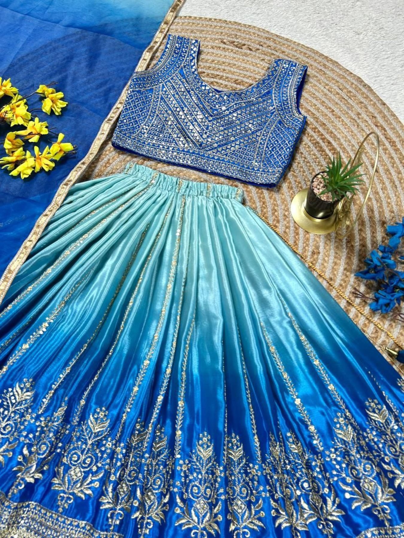 Designer chinon silk lehenga set featuring sequins embroidery with print work paired with butterfly net dupatta. Lightweight and perfect for festive and party wear.