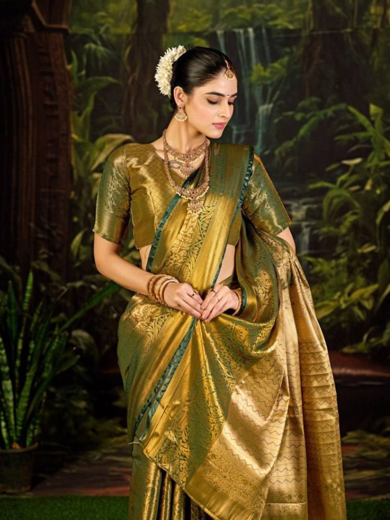 Graceful Bottle Green Kanjivaram Semi Silk Saree with Floral Khaddi Border and Traditional Pallu