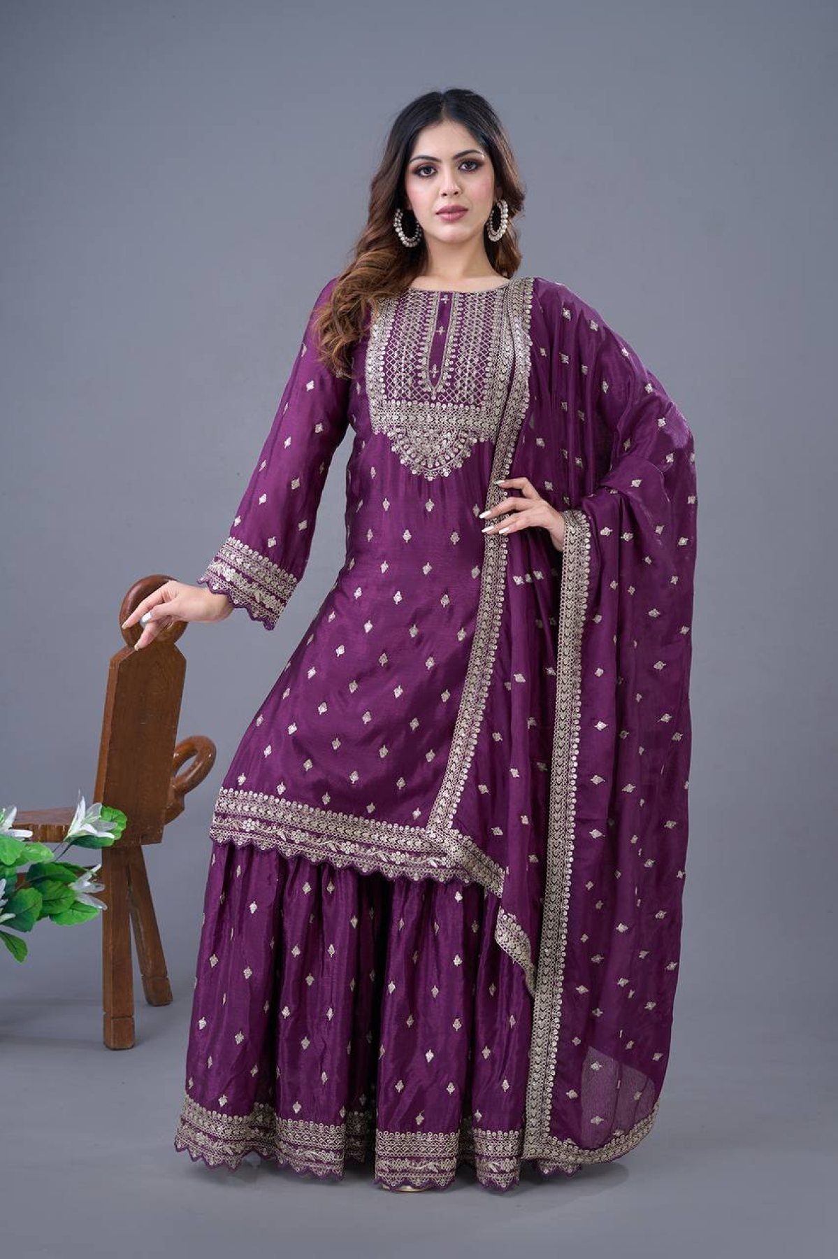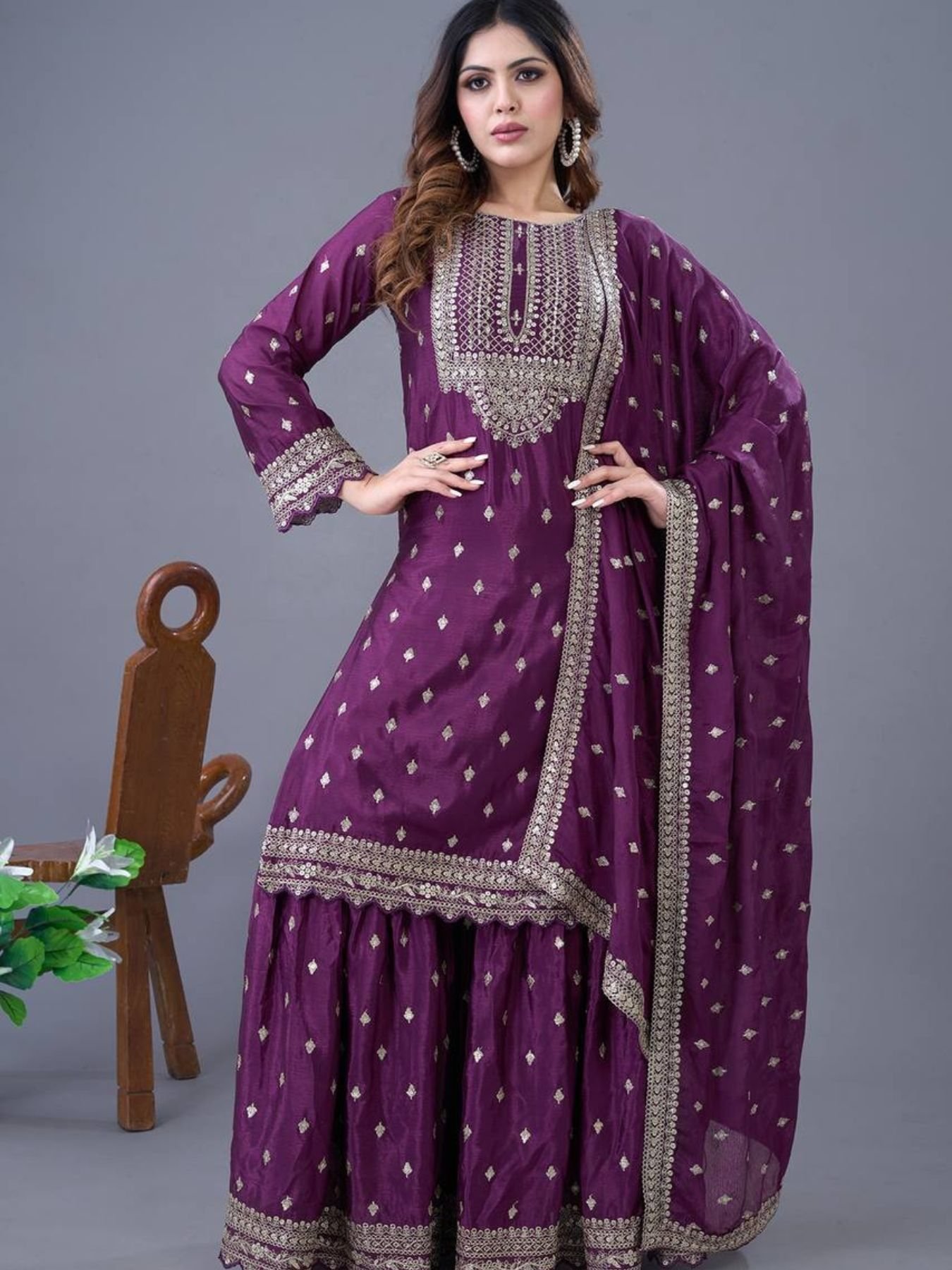 Graceful Fully Stitched Ready to Wear Purple Chinon Silk Sharara Suit with Embroidery