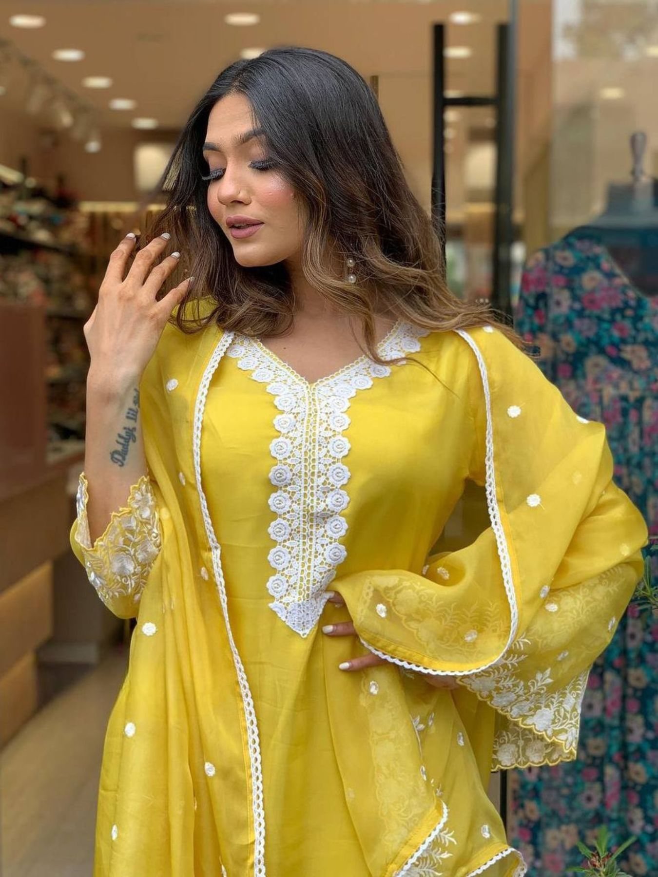 Graceful Georgette Sunshine Yellow Kurti Set with Intricate Embroidery Ethnic Wear for Women