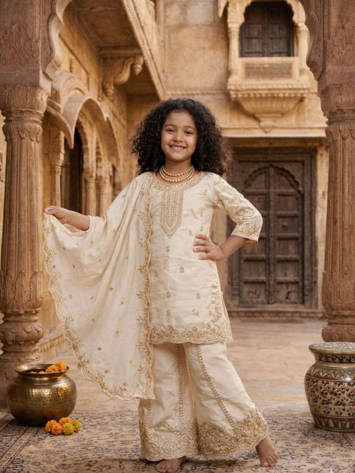 Graceful Off-White Silk Blend Designer Kurta Palazzo Set for Kids