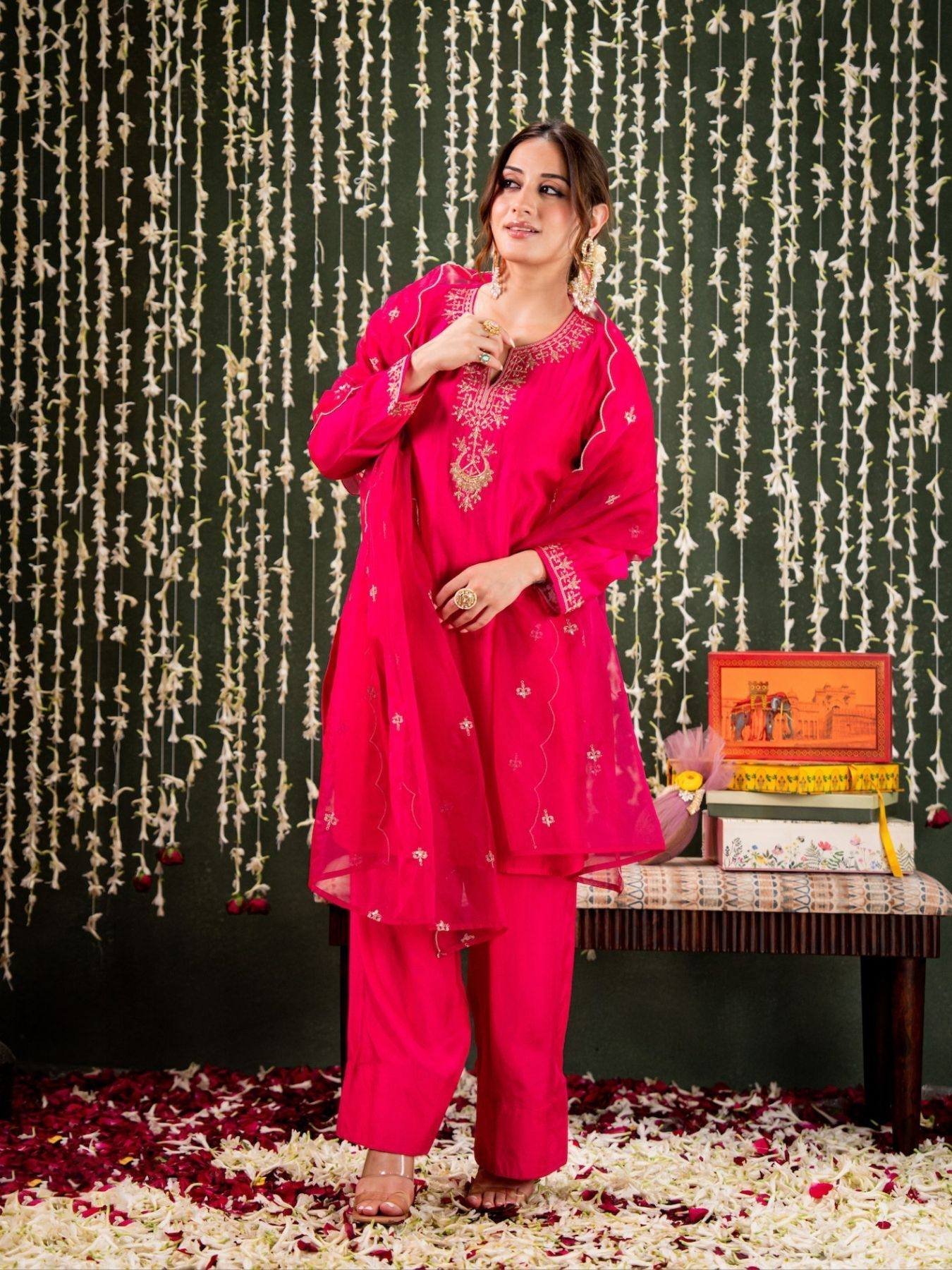 Grace your festive wardrobe with this Pink and Orange Chanderi Embroidered Suit Set, crafted for timeless sophistication.