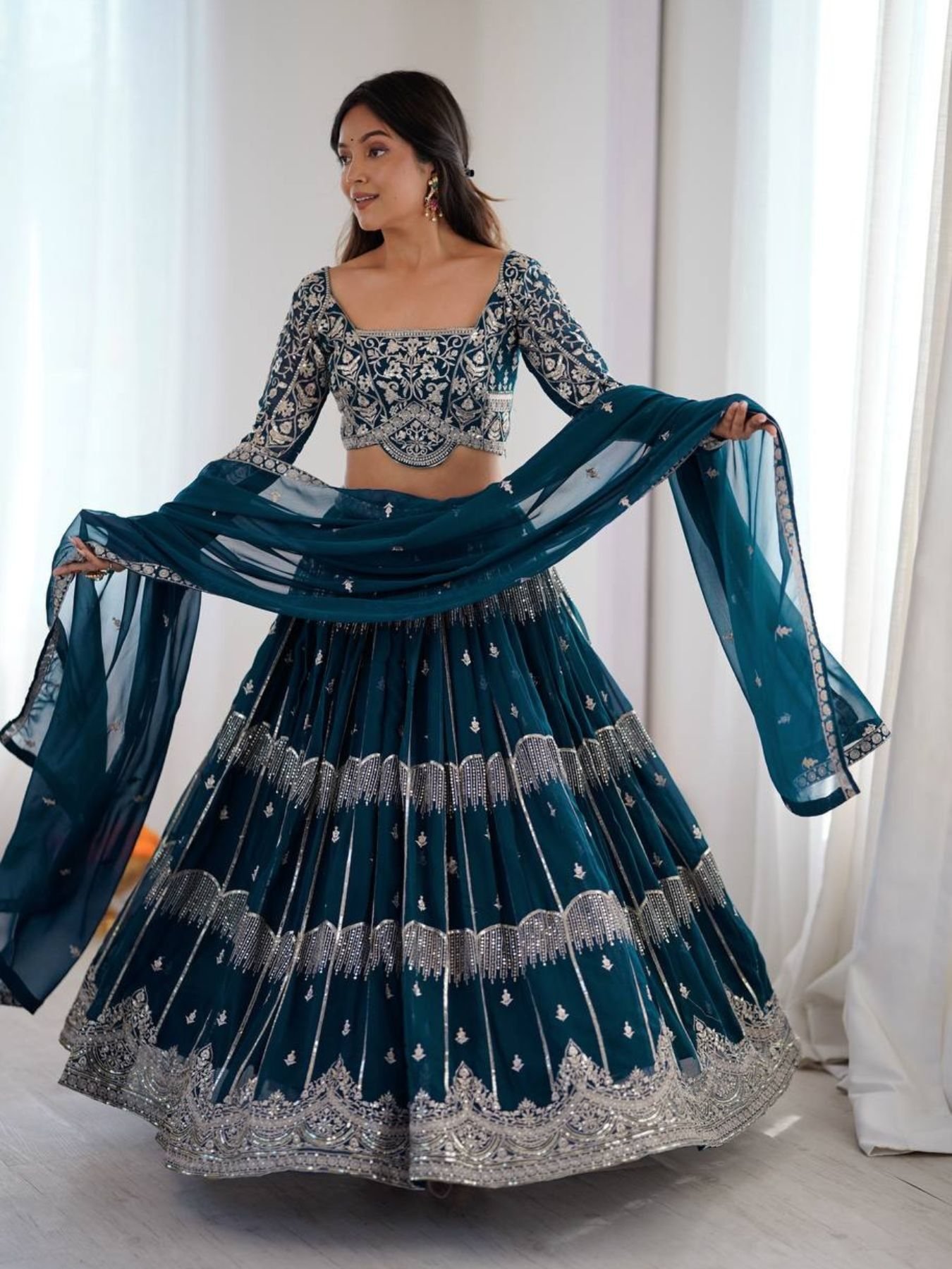 Elegant faux georgette lehenga set designed with intricate thread embroidery and sequin work. Featuring a grand 3.5-meter flair with cancan and canvas patta, paired with a matching blouse and dupatta, perfect for weddings, festive occasions, and party wear.
