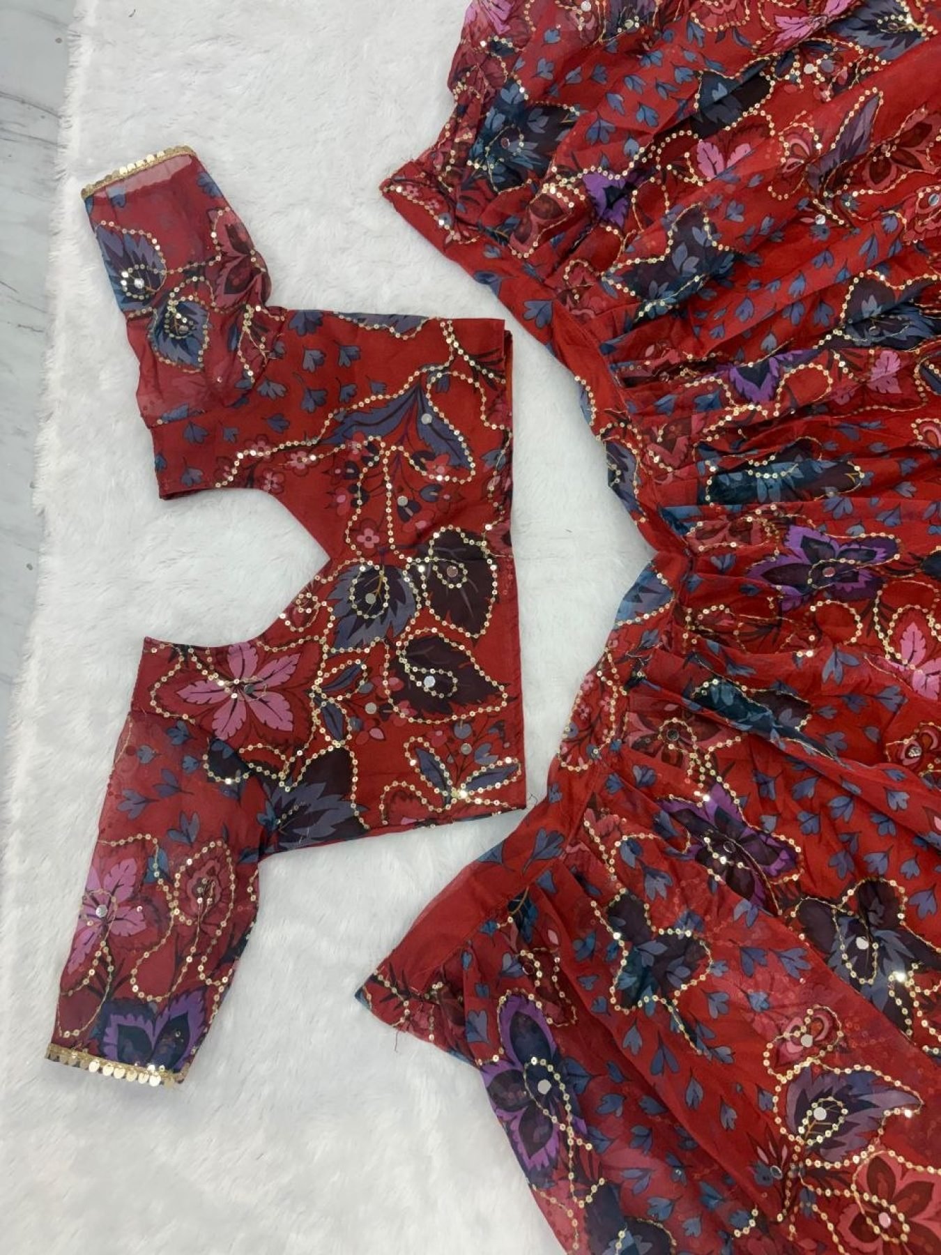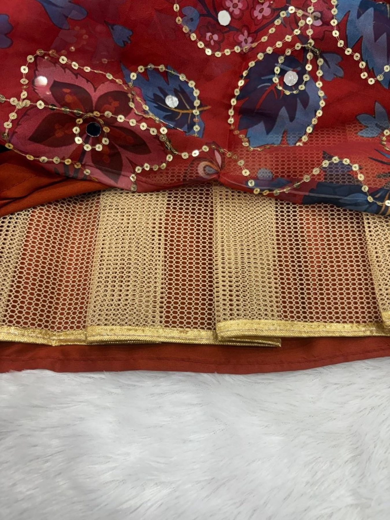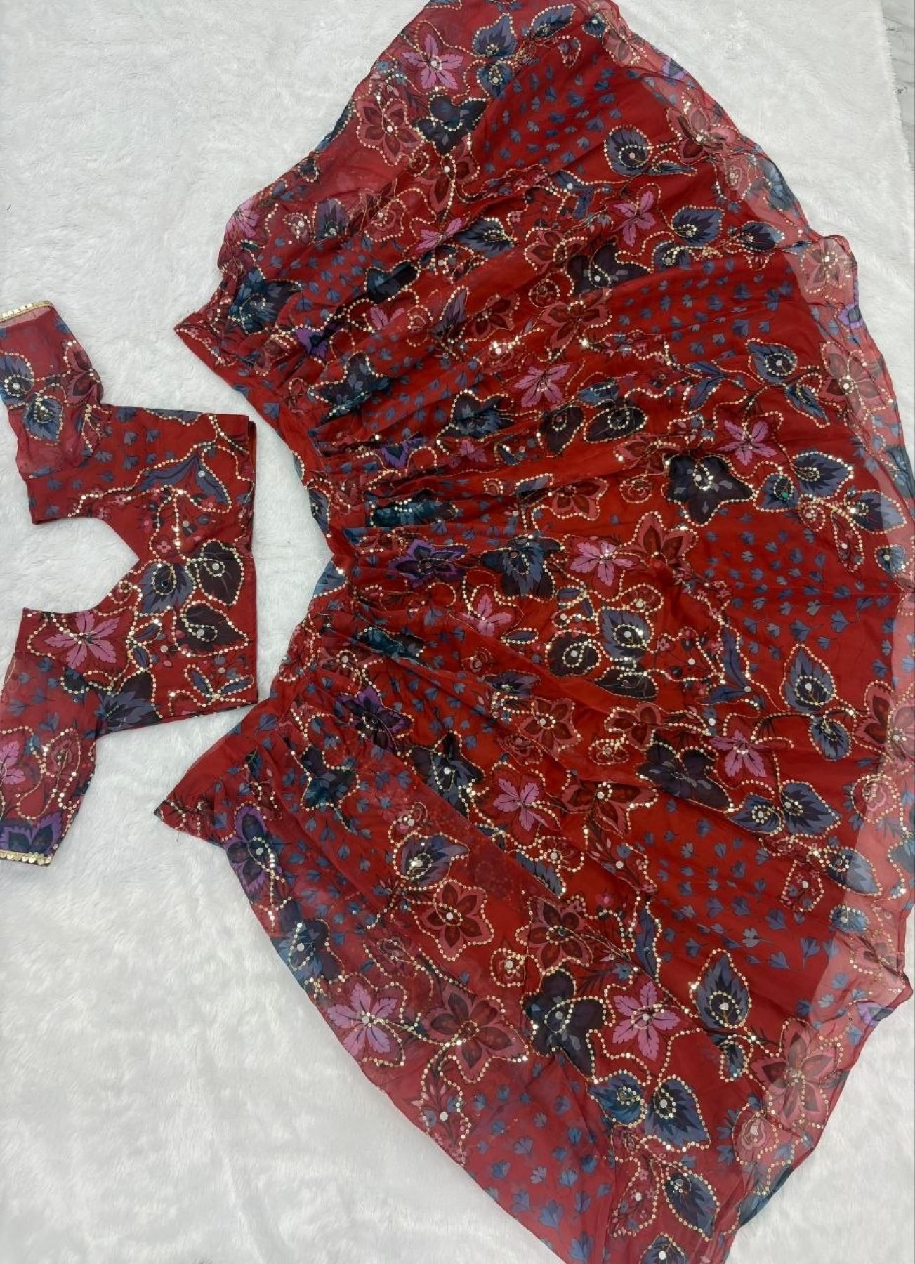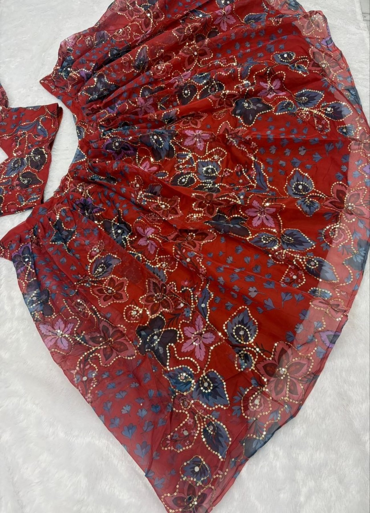 Premium taby silk lehenga set designed with beautiful prints, embroidery sequins work, and real mirror detailing. Featuring a grand 3.5-meter flair with heavy cancan and double inner lining, this outfit delivers a rich showroom finish, perfect for weddings, festive occasions, and party wear.