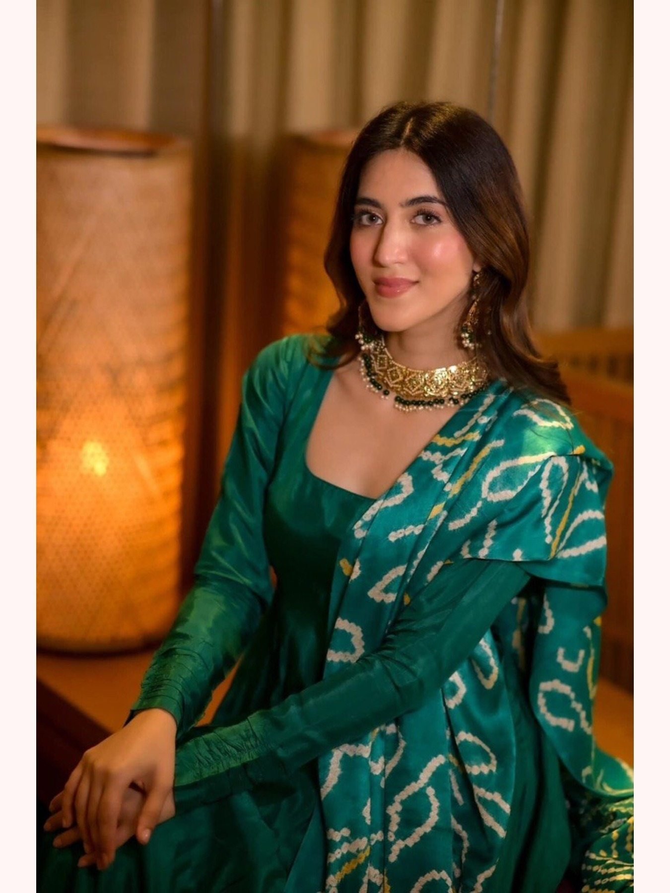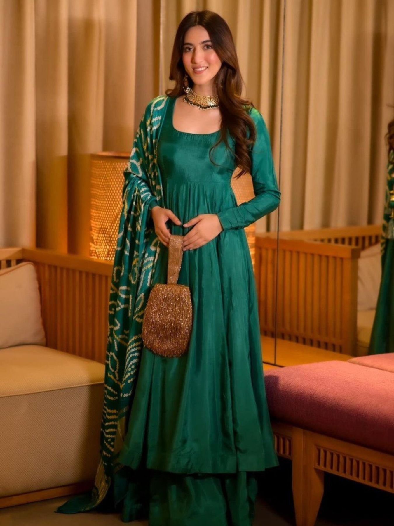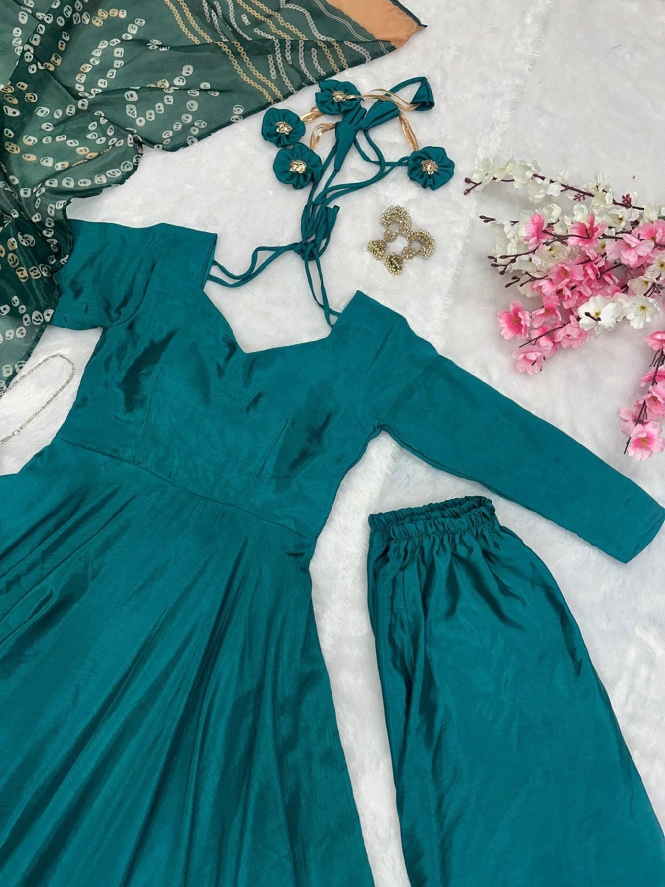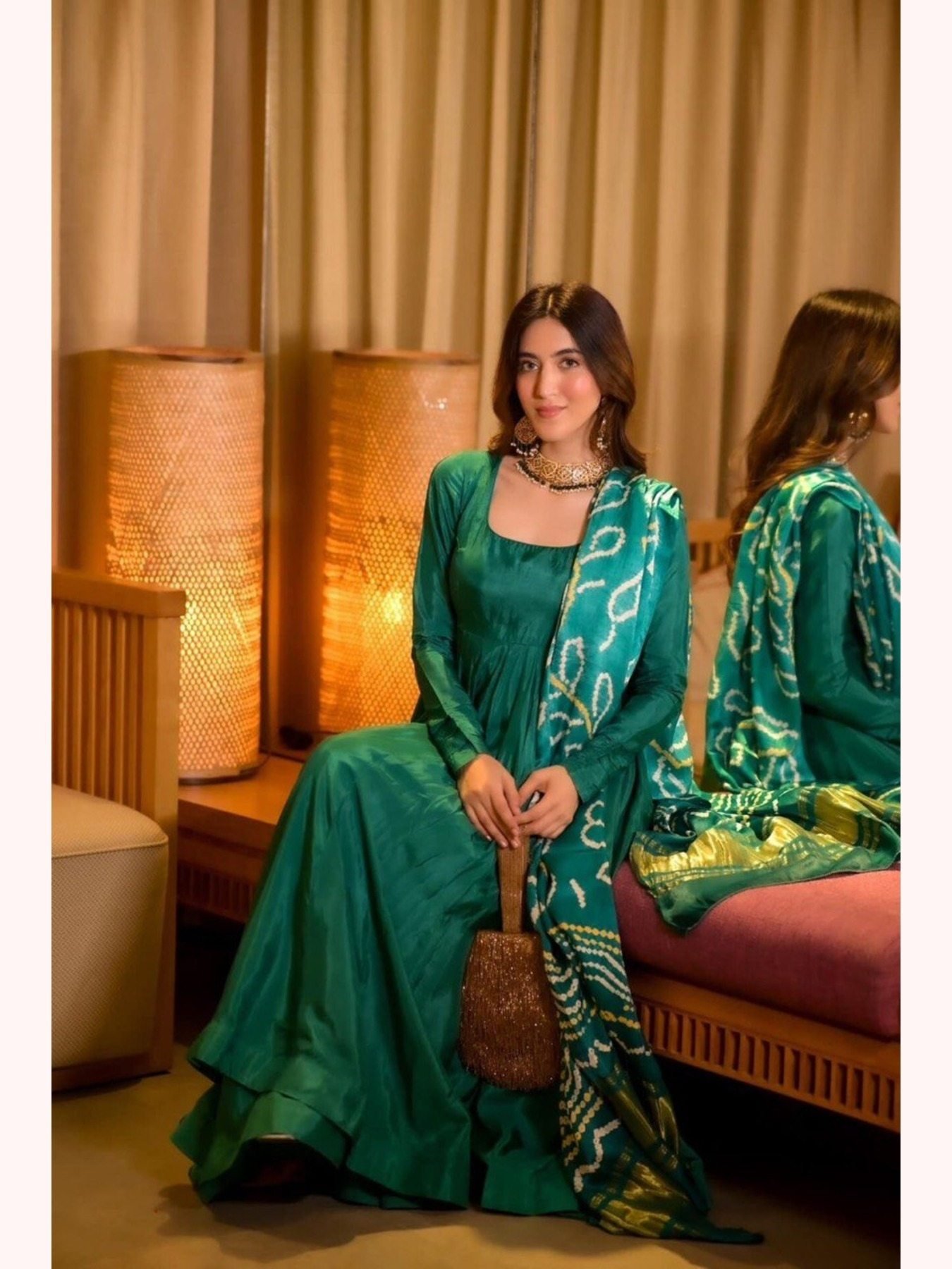 Green Color Chinnon Silk Anarkali Kurti With Cotton Dupatta