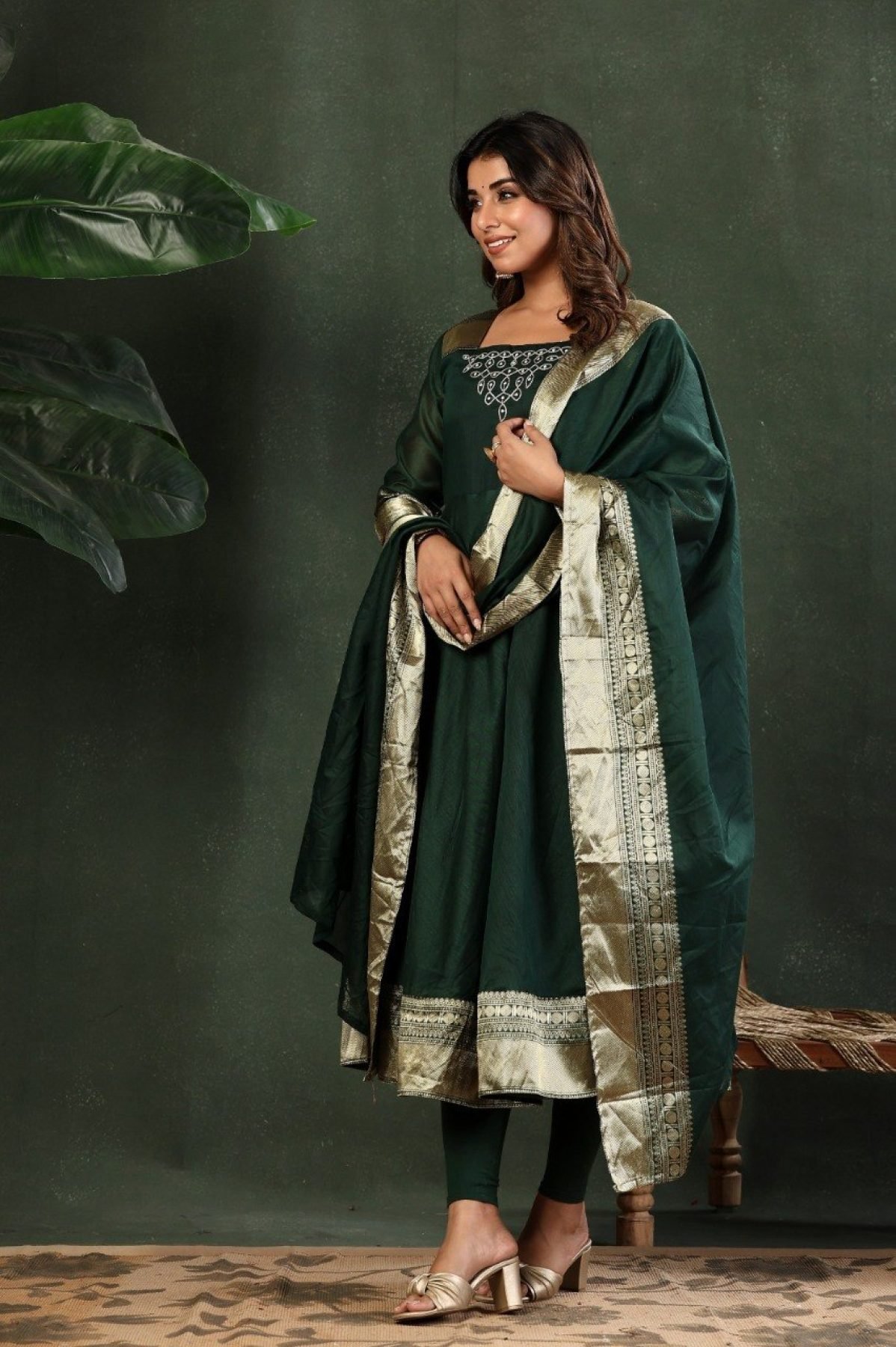 Green Kanchi Cotton Maxi Gown with Jacquard Lace and Embroidery for Festive Wear