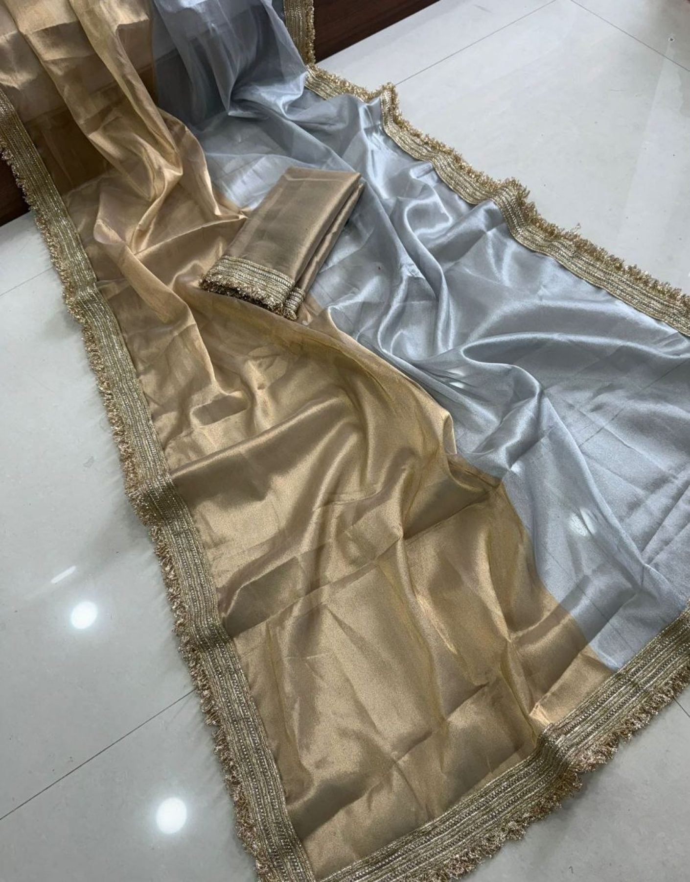 Grey Golden Viscose Tissue Organza Saree with Fancy Lace Border for Party Wear