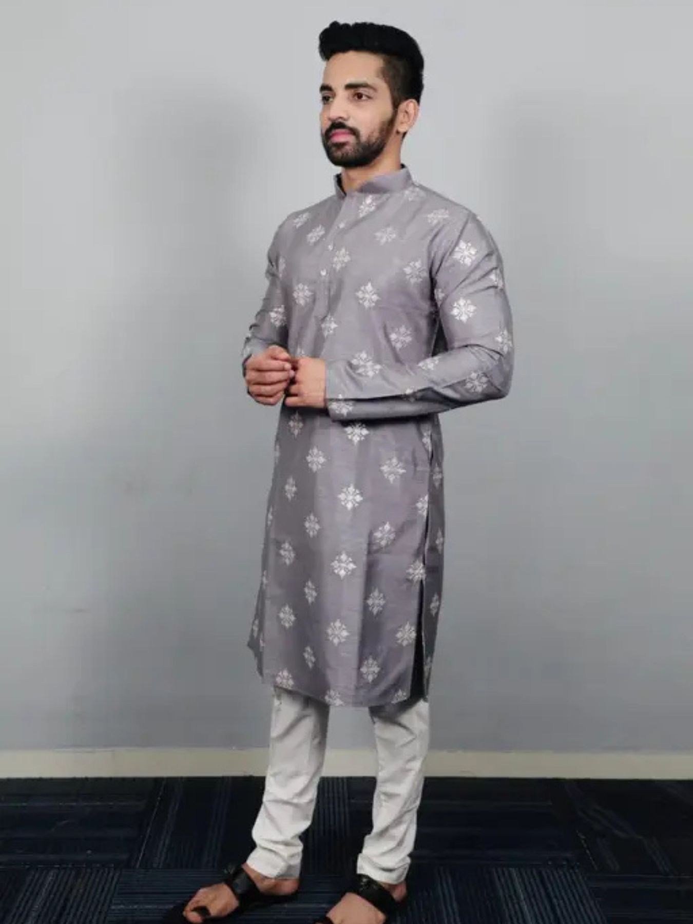 Grey Snowflake Embroidered Kurta Pajama Set for Men Ready to Wear Designer Ethnic Look