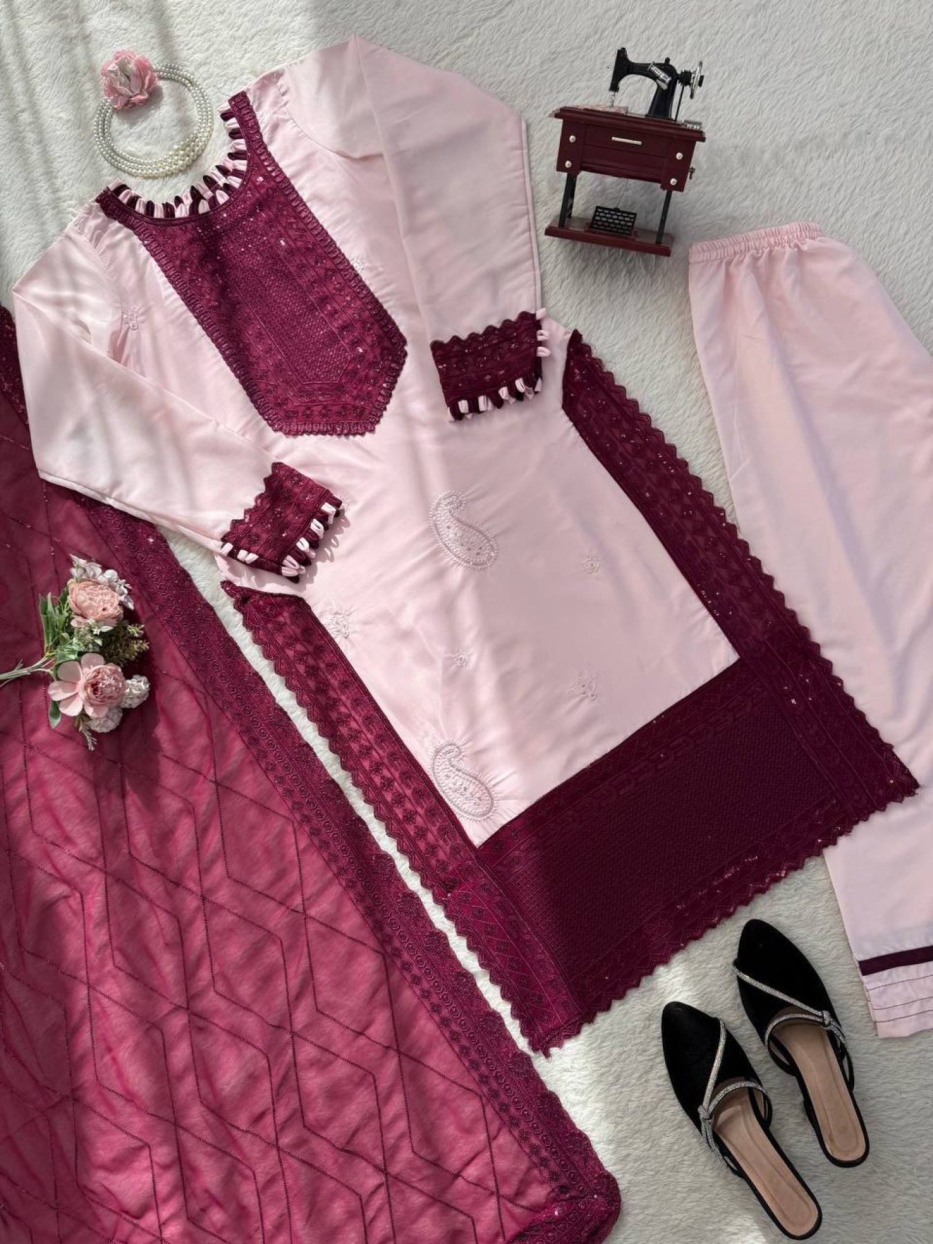 Elegant top pant set crafted in heavy natural crepe featuring intricate thread and sequence work. Paired with lace work pants and a beautifully designed faux georgette dupatta, perfect for festive wear and special occasions.